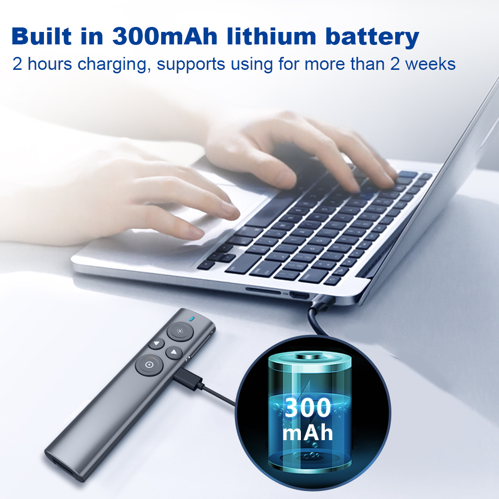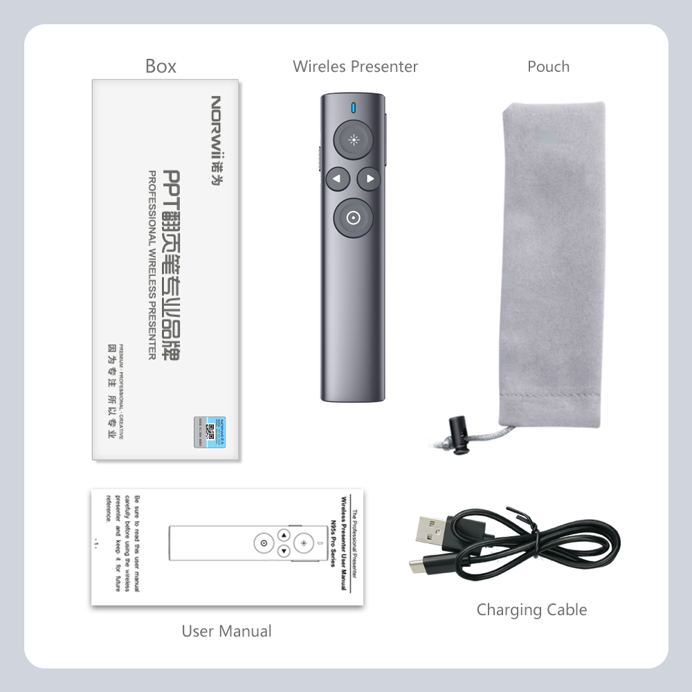 Bút trình chiếu NORWii N95 Pro Spotlight cao cấp 2in1 Thông số kỹ thuật :  Model : NORWii N95 Pro SPOTLIGHT Kết nối : 2.4GHz Đầu USB 2in1 :thu phát Wireless 2.4Ghz và USB dung lượng lưu trữ 256MB Bán kính hoạt động : 50m Laser : Tia kĩ thuật số và tia Laser vật lý ( màu đỏ ) Laser vật lý chỉ tối đa 200m Pin: Pin lithium 300mAh Nguồn sạc : 5V Cổng sạc : USB Type C Điện áp làm việc: 3.7V ~ 4.2V Kích thước: 131 29.6 13.2mm Cân nặng: 34.5g Chức năng : Thuyết trình, trình chiếu trong hội nghị, họp công ty, văn phòng, giảng bài trên các phần mềm như PowerPoint, Word, Canva và các phần mềm chuyên dụng khác. Hỗ trợ các HĐH : Windows, Linux, MacOS, Android từ 4.3 trở lên . Bộ sản phẩm gồm : Bút laser, Cáp sạc Type c, Túi đựng nhung, HDSD, Hộp. Sản phẩm cắm usb kết nối và dùng trực tiếp các tính năng cơ bản của bút trình chiếu Ưu điểm nổi bật : Tia chỉ kỹ thuật số giúp bạn có thể chỉ điểm rõ ràng trên mọi màn hình máy tính, tivi, màn máy chiếu, màn LED, màn LCD Ngoài ra, bút vẫn có laser vật lý tia đỏ như các dòng bút thông thường giúp bạn chỉ điểm trên màn chiếu,bảng, tường tiện dụng Bật , tắt video trong Slides dễ dàng chỉ bằng thao tác trên bút. Nhiều tính năng nâng cao trên bút giúp bài thuyết trình được trình bày sáng tạo nổi bật và chi tiết hơn. Tính năng Spotlight chọn vùng cần làm nổi bật ( có thể tăng hoặc giảm vùng chọn tùy ý ). Tính năng phóng to vùng chọn làm tăng kích thước điểm ảnh giúp người bên dưới quan sát rõ hơn. Tính năng chuột giúp thao tác trên slide như đang sử dụng chuột có thể bật tắt video, mở file, mở liên kết Bút cũng có chế độ rung hẹn giờ báo khi nào thời gian thuyết trình sắp hết để bạn chủ động hơn. Chế độ viết ghi chú Note trên Slides rất tiện lợi. Ngoài ra, còn 1 vài tính năng như tăng, giảm âm lượng, chuyển tab, rung báo kết nố , quý khách có thể tham khảo thêm trong phần mềm cài đặt quản lý. Bút mang đến sự thuận tiên cho người dùng với cổng sac USB C hiện đại và có thể dùng 3 tháng với chỉ 1 lần sạc 2h. Sản phẩm phù hợp với mọi nhu cầu thuyết trình từ cơ bản đến nâng cao. Đồng thời, rất thích hợp với nhu cầu trình chiếu trên màn hình tivi, màn LED đang phổ biến hiện nay.