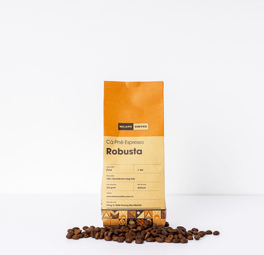 Từ 100% Robusta tinh túy rang mộc trồng từ vùng cao nguyên, MILANO COFFEE lựa chọn độ rang vừa (Medium roast), cho ra mắt dòng sản phẩm pha máy mới: CÀ PHÊ ESPRESSO ROBUSTA.      Robusta là loại cà phê được biết đến với vị đậm đà, mạnh, đắng và nồng, có hàm lượng caffein cao, thích hợp với những gu cà phê truyền thống. Sau khi được rang ở nhiệt độ 210-220 độ C, những hạt cà phê bung nở, tính acid bắt đầu giảm, tạo nên hương vị hài hòa và sự cân bằng giữa độ ngọt, vị chua và đắng của cà phê.   Quy trình chọn lựa và rang xay theo quy chuẩn  nghiêm ngặt của nhà máy, MILANO COFFEE mang đến dòng sản phẩm mới đặc biệt dành riêng cho gu thưởng thức Espresso. Với cách pha máy đặc trưng của dòng cà phê này, đây hứa hẹn sẽ là sản phẩm mang đến những ly cà phê đậm đà với lượng caffeine cao trong tích tắc, nạp nhanh năng lượng và tỉnh táo tức thì.   Ngoài ra, thiết kế túi Kraft mộc cán màng nhôm bên trong cùng với van 1 chiều thoáng khí của Cà phê Espresso Robusta không chỉ thân thiện với môi trường mà còn giúp bảo quản sản phẩm và giữ nguyên hương vị cà phê thơm ngon, trọn vẹn khi sử dụng.