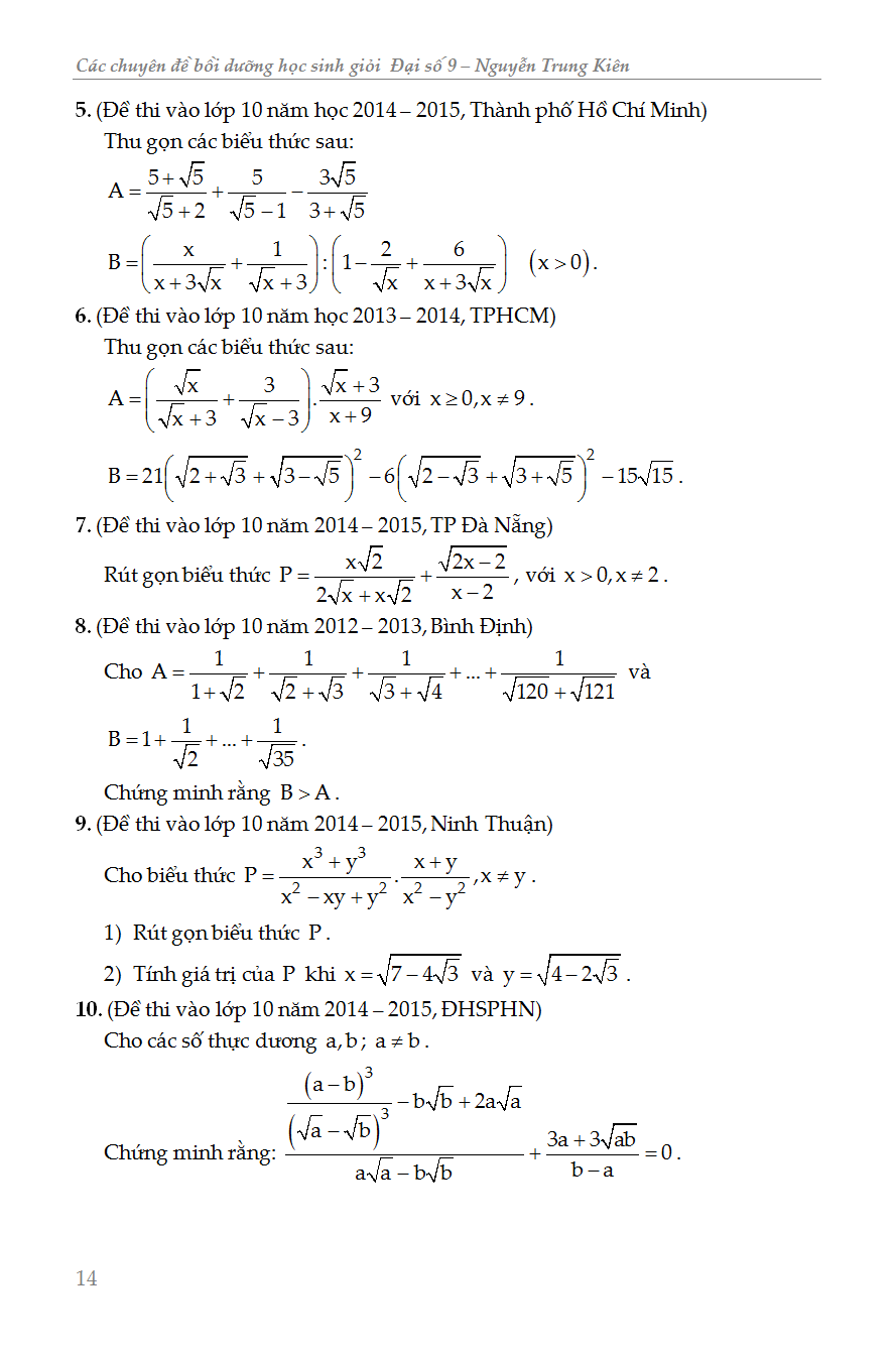 Nhằm giúp các em học sinh lớp 9 ôn thi vào lớp 10 THPT cũng như các em học sinh chuyên Toán có một tài liệu mang tính hệ thống để ôn luyện, nâng cao kiến thức kỹ năng giải toán và đạt kết quả cao nhất trong các kỳ thi Học sinh giỏi, kỳ thi Tuyển sinh vào lớp 10 cũng như thi vào các lớp chuyên, tôi biên soạn cuốn: “Các chuyên đề bồi dưỡng học sinh giỏi đại số 9’’.