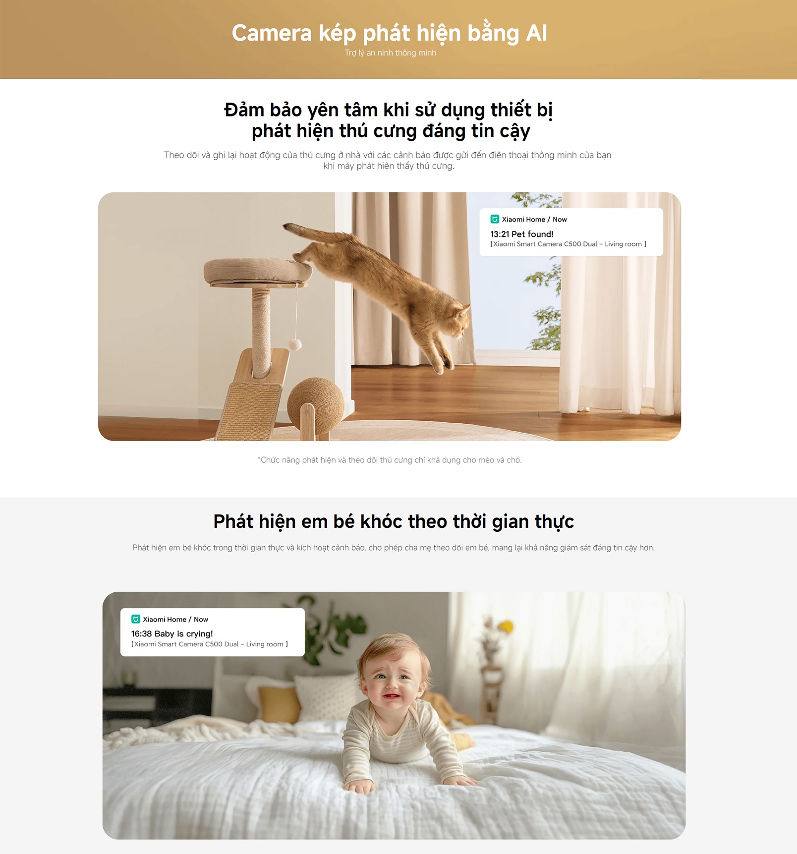 AI phát hiện người, chuyển động, âm thanh lạ và phát hiện thú cưng, tiếng khóc trẻ em