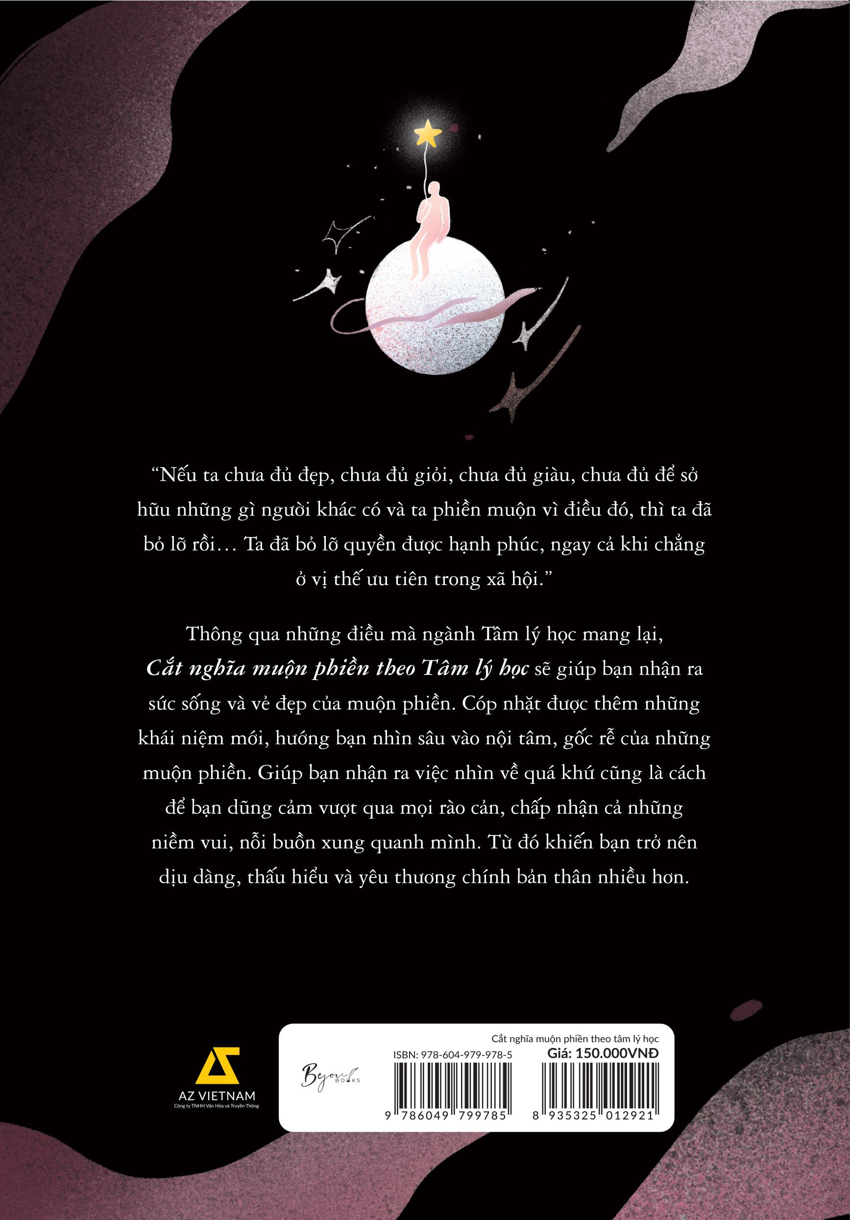 - Chưa tự do giữa những mối quan hệ xung quanh, viện cớ dễ tổn thương, sợ bị đánh giá và khó tha thứ. Bốn nguyên nhân trên sẽ tương ứng với bốn chương của cuốn sách. Nhưng thay vì ngập chìm trong nỗi buồn, bạn sẽ tìm ra được cách thức “chăm sóc”, thoát khỏi muộn phiền thông qua sự giúp đỡ của tác giả Đặng Hoàng Ngân - tiến sĩ Tâm lý học. Đặc biệt, chị còn được biết đến với vai trò nhà thực hành tâm lý tại VinBrain, trong lĩnh vực ứng dụng AI vào tâm lý học, đồng thời là tác giả của những đầu sách tên tuổi như: Một m.ình tìm một nửa - Tâm lý học về độc thân và tình yêu; Phía trước của trưởng thành. Cuốn sách “Cắt nghĩa muộn phiền theo tâm lý học” sẽ dẫn dắt bạn chạm vào hạnh phúc và sự tự do phía sau những muộn phiền, để bạn có một tâm trí khỏe mạnh hơn.