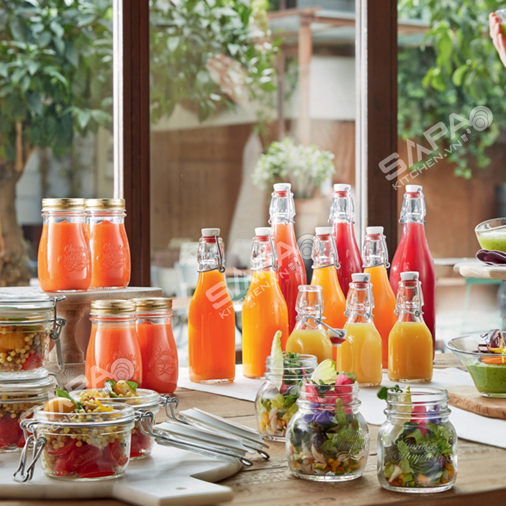 - Chai làm từ chất liệu thủy tinh cao cấp, trong suốt giúp bạn quan sát và phân biệt dễ dàng thực phẩm chứa trong chai. Có thể dùng để trang trí bàn ăn, tủ kính.