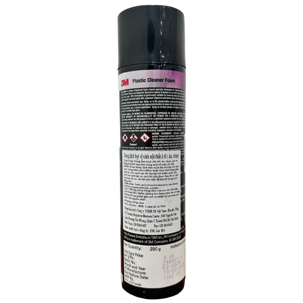 Giới thiệu Chai xịt bọt vệ sinh da, nhựa nội thất ô tô đa năng 3M 3M-NNT Chai xịt bọt vệ sinh da, nhựa nội thất ô tô đa năng 3M 3M-NNT loại bỏ bụi bẩn cứng đầu như dầu, mỡ, silicone và dư lượng côn trùng. An toàn khi dùng trên nhựa, sơn, vinyl, crôm và kim loại. Với công thức bọt cao cấp khi vệ sinh sẽ không cần dùng nước mà vẫn có thể tiêu diệt 99% vi trùng, vi sinh vật có hại Thông tin sản phẩm