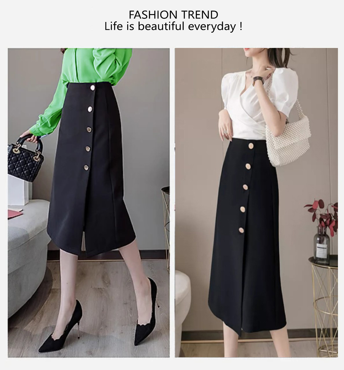 MÔ TẢ SẢN PHẨM ️Phom váy chữ A dài qua gối tôn dáng ️Chân váy lưng cao phía trước có nút rất duyên dáng tạo điểm nhấn riêng cho sản phẩm. ️Chất liệu vải nhập có độ co giãn tạo cảm giác thoáng mát, dễ chịu. ️Có khóa sau dấu không lộ viền. ️Video thật của Shop ️Dễ mix nhiều kiểu áo khác nhau :