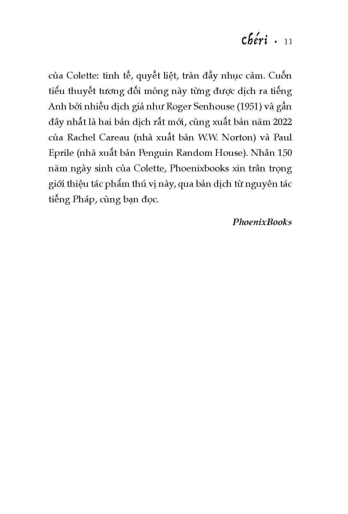 Nếu Chéri và Léa đổi chỗ cho nhau, chúng ta sẽ không có một chuyện tình tai tiếng nữa, không có một tiểu thuyết cảm động và rất đối ý nhị nữa. “Chéri” có thể coi là một tác phẩm kinh điển bộc lộ một cách thẳng thắn về quan điểm về tình yêu và phong cách của Colette: tinh tế, quyết liệt, tràn đầy nhục cả