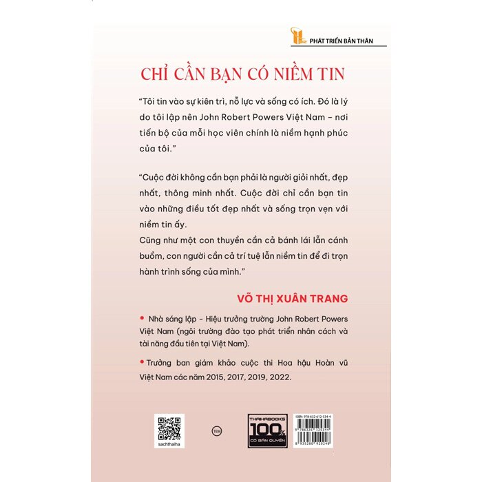 Cuốn sách “Chỉ cần bạn có niềm tin” là cuốn tự truyện của tác giả Võ Thị Xuân Trang, kể về hành trình đầy cảm hứng từ một cô gái miền Tây đến nữ doanh nhân thành đạt, người sáng lập và điều hành trường John Robert Powers Việt Nam.