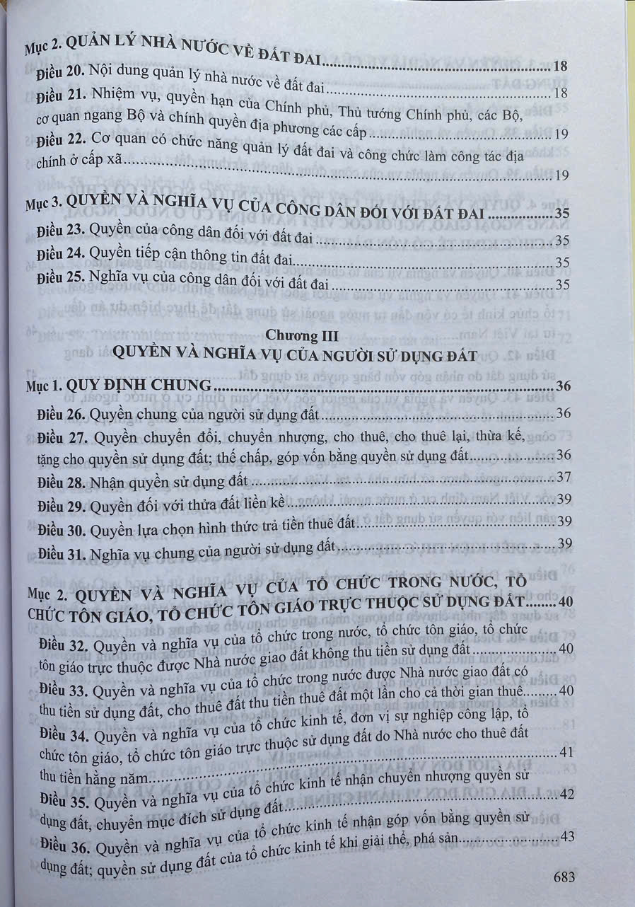 Mua tại TiktokLuật Đất đai số 31/2024/QH15 được Quốc hội nước Cộng hòa xã hội chủ nghĩa Việt Nam khóa XV, kỳ họp bất thường lần thứ năm thông qua ngày 18 tháng 01 năm 2024, có hiệu lực kể từ ngày 01 tháng 8 năm 2024. Để đưa Luật quan trọng này vào cuộc sống, giúp độc giả và Nhân dân hiểu quy định của pháp luật về đất đai vừa có hiệu lực thi hành, Nhóm tác giả đã biên soạn cuốn sách "CHỈ DẪN TRA CỨU VÀ ÁP DỤNG LUẬT ĐẤT ĐAI NĂM 2024". Cuốn sách gồm 16 nội dung, tương đương với 16 chương của Luật Đất đai năm 2024, với đầy đủ các văn bản mới nhất hướng dẫn thi hành từng nội dung cụ thể trong Luật này: