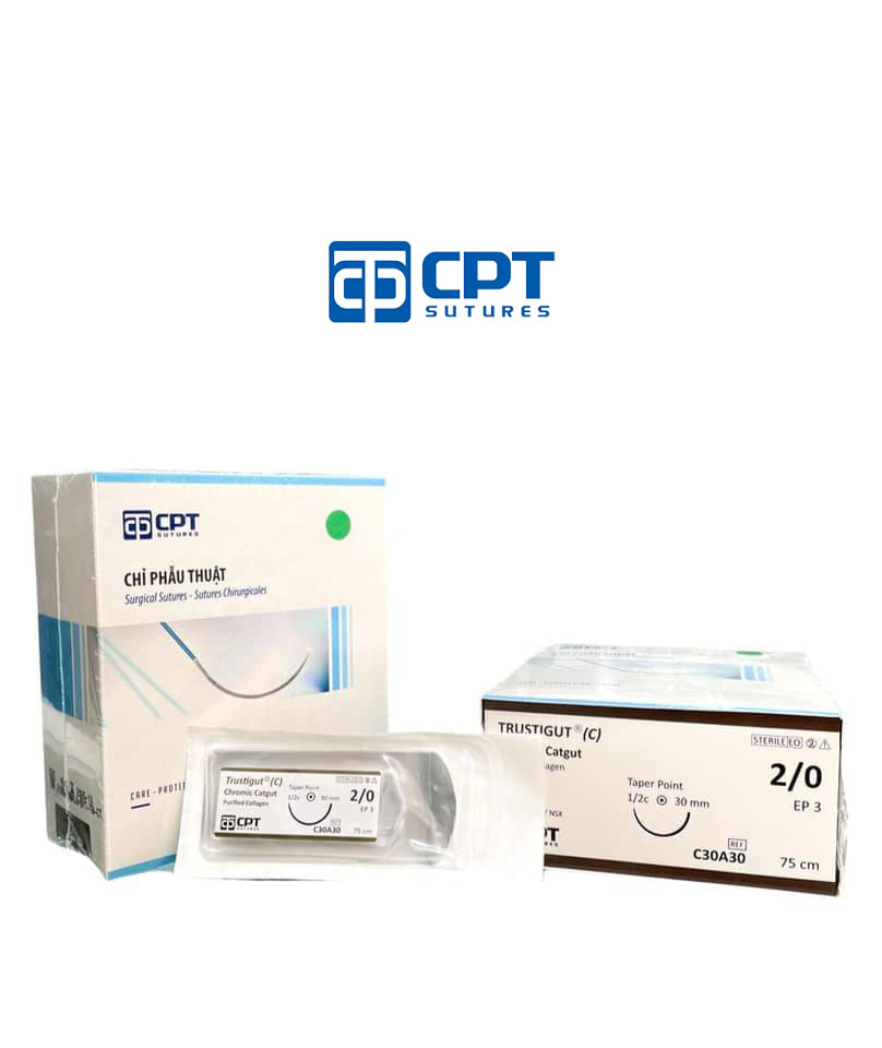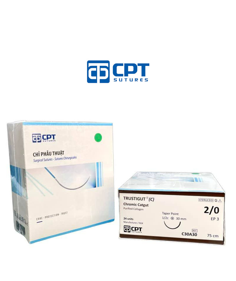 Chỉ phẫu thuật tự tiêu tan chậm CPT Trustigut (C) Chromic Catgut: size cỡ chỉ: 2/0 USP, dài 75 cm, kim tròn 1/2c, dài 30 mm, mã hàng: C30A30. Quy cách đóng gói: 24 tép. THÀNH PHẦN: