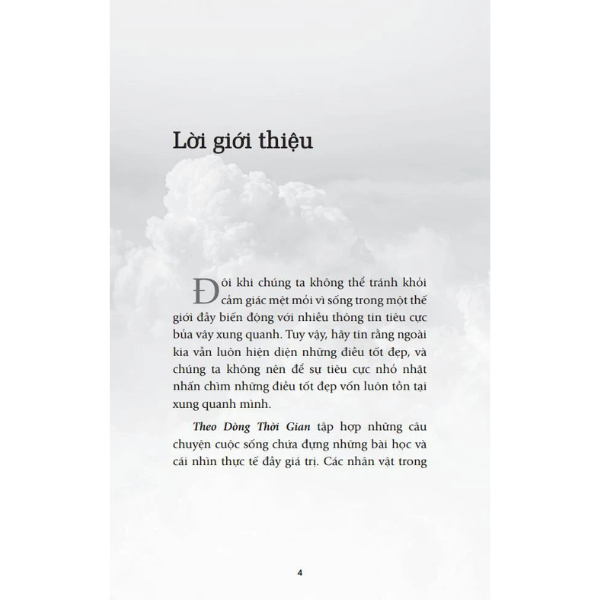 Cho dù cuộc sống có diễn ra như thế nào đi nữa, bạn hãy luôn hiểu rằng: Tất cả những điều đã và đang xảy ra đều ẩn chứa một ý nghĩa nào đó để bạn trải nghiệm và biết ơn. Đằng sau những giọt nước mắt đâu chỉ là khổ đau mà cũng có thể là niềm hạnh phúc. Đôi khi trong những thời khắc thử thách nhất, bạn mới phát hiện ra được “kho báu” ẩn giấu trong chính những điều bình dị nhất. Hy vọng rằng “Theo Dòng Thời Gian” sẽ mang lại cho bạn cái nhìn lạc quan và tươi sáng hơn để thêm yêu đời và yêu người.