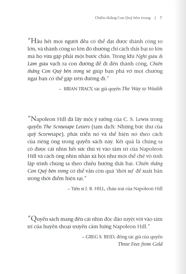 Nếu câu trả lời là có thì “Chiến thắng Con Quỷ bên trong” (tựa gốc: Outwitting the Devil: The Secret to Freedom and Success) chính là cuốn sách bạn cần đọc. Tác phẩm đặc biệt này của Napoleon Hill đã được cất giấu trong suốt 72 năm bởi những khía cạnh dễ gây tranh cãi của nó. Hành vi của Con Quỷ trong cuộc sống hằng ngày của mỗi con người, trong nhà thờ, ở nơi trường học, và trong đời sống chính trị, nếu được công bố hẳn sẽ đe dọa đến tận gốc rễ của xã hội thời bấy giờ. Và khi được xuất bản lần đầu tiên vào năm 2011, cuốn sách giống như một “kho báu vừa được khám phá”, ngay lập tức gây được tiếng vang bởi giá trị vượt thời gian của các thông điệp và triết lý mà nó mang lại. Cuốn sách nhanh chóng được dịch sang khoảng 20 thứ tiếng và đến nay vẫn thường xuyên có mặt trong danh sách khuyến đọc của các nhà lãnh đạo thành công.