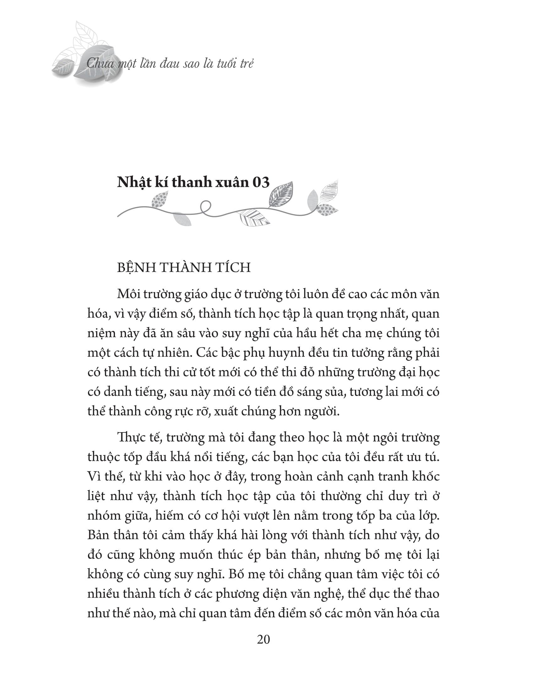 Nếu có thể làm cho bản thân mình trở nên kiên cường và hiểu biết hơn thì những vấp ngã kia có sá gì? Chỉ cần bên cạnh bạn có những đôi tay sẵn sàng chìa ra nâng đỡ, có những bờ vai cho bạn tựa vào, có những cái ôm động viên khích lệ, vậy thì quá trình trưởng thành của bạn vĩnh viễn không hoài phí, mà còn nhận được nhiều hơn. Cuốn sách này gồm 45 câu chuyện về những nỗi ưu phiền thời thanh xuân của bất kì ai trong chúng ta, hãy mang theo nó và lòng can đảm tiến về phía trước để có những trải nghiệm, cảm nhận và tìm ra lời giải cho những nỗi đau đớn mà bạn đang ôm giữ trong lòng…