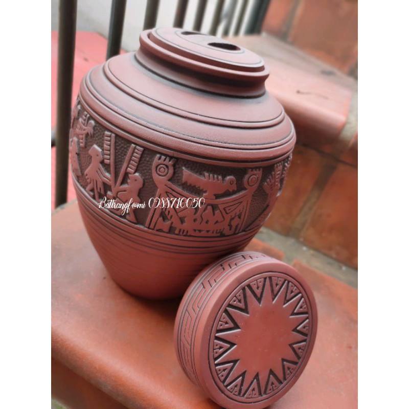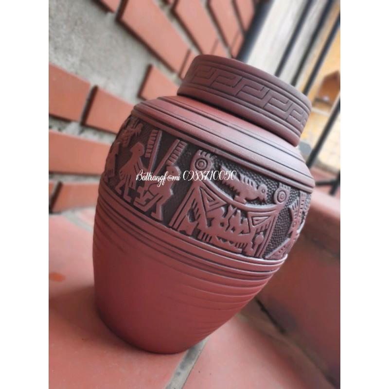 Dòng chum Sành cao cấp dùng trong Phòng Khách. ✯ Lần đầu tiên hình ảnh trống đồng được tái hiện trên chiếc chum sành độc đáo. ✯ Thiết kế đặc biệt với 2 lớp nắp, giúp cho việc sử dụng trở lên dễ dàng. ✯ Nguyên liệu đất hiếm từ thiên nhiên: Cốt đất đặc trưng của gốm Bát Tràng được cối tạo nên từ đất sét đặc biệt và phù sa của dòng sông Hồng. ✯ Thẩm thấu, khuyết tán Aldehit ra ngoài qua thành chum. Chất liệu sành cao cấp lọc bỏ tạp chất.