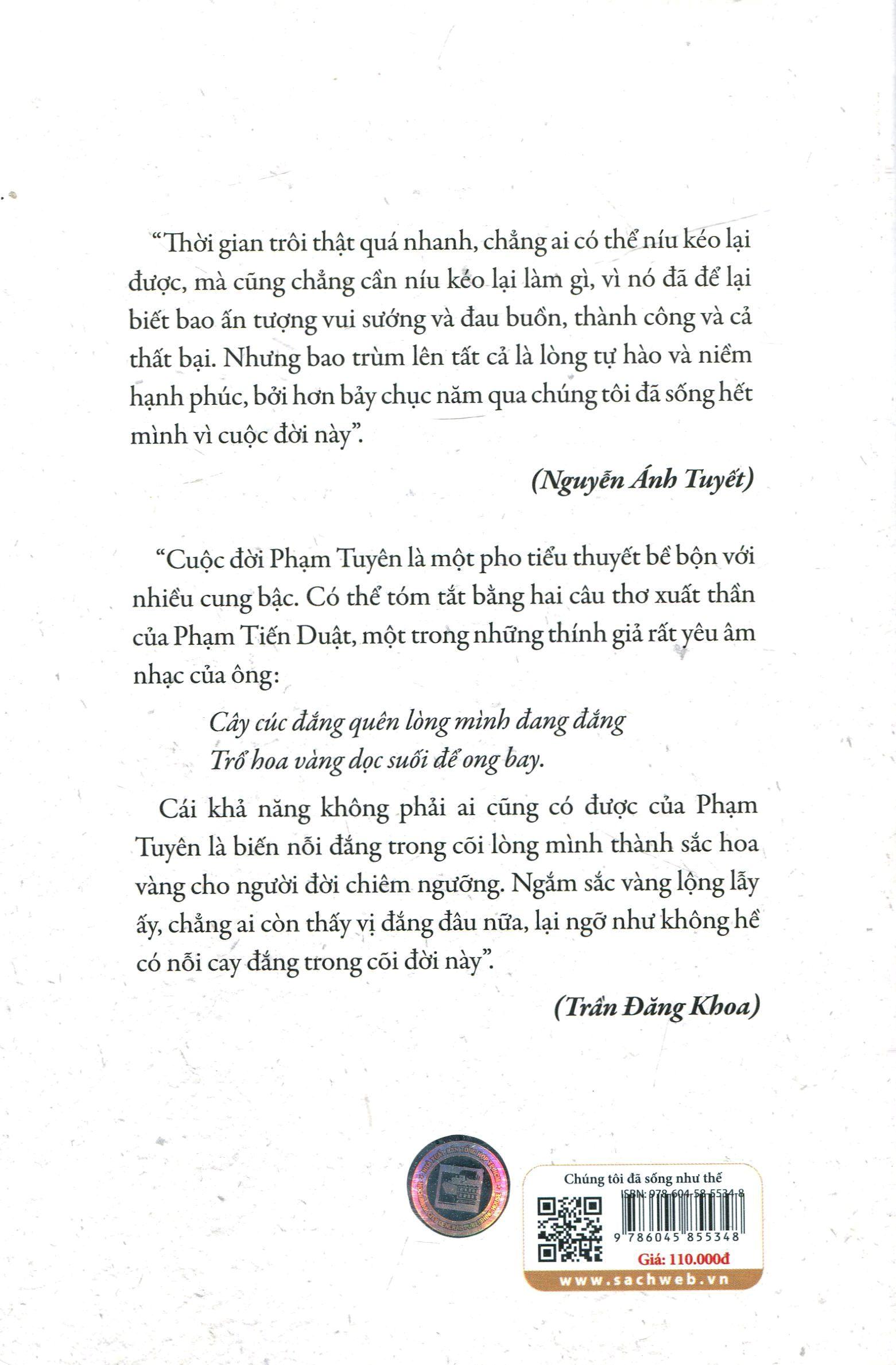 Chúng Tôi Đã Sống Như Thế trên danh nghĩa tác giả là bà Nguyễn Ánh Tuyết, vợ nhạc sĩ Phạm Tuyên, tuy nhiên phần nội dung trong tác phẩm lại là hồi ký chung của hai vợ chồng, thậm chí trên trang bìa cũng có ghi rõ "Hồi ký của vợ chồng nhạc sĩ Phạm Tuyên".