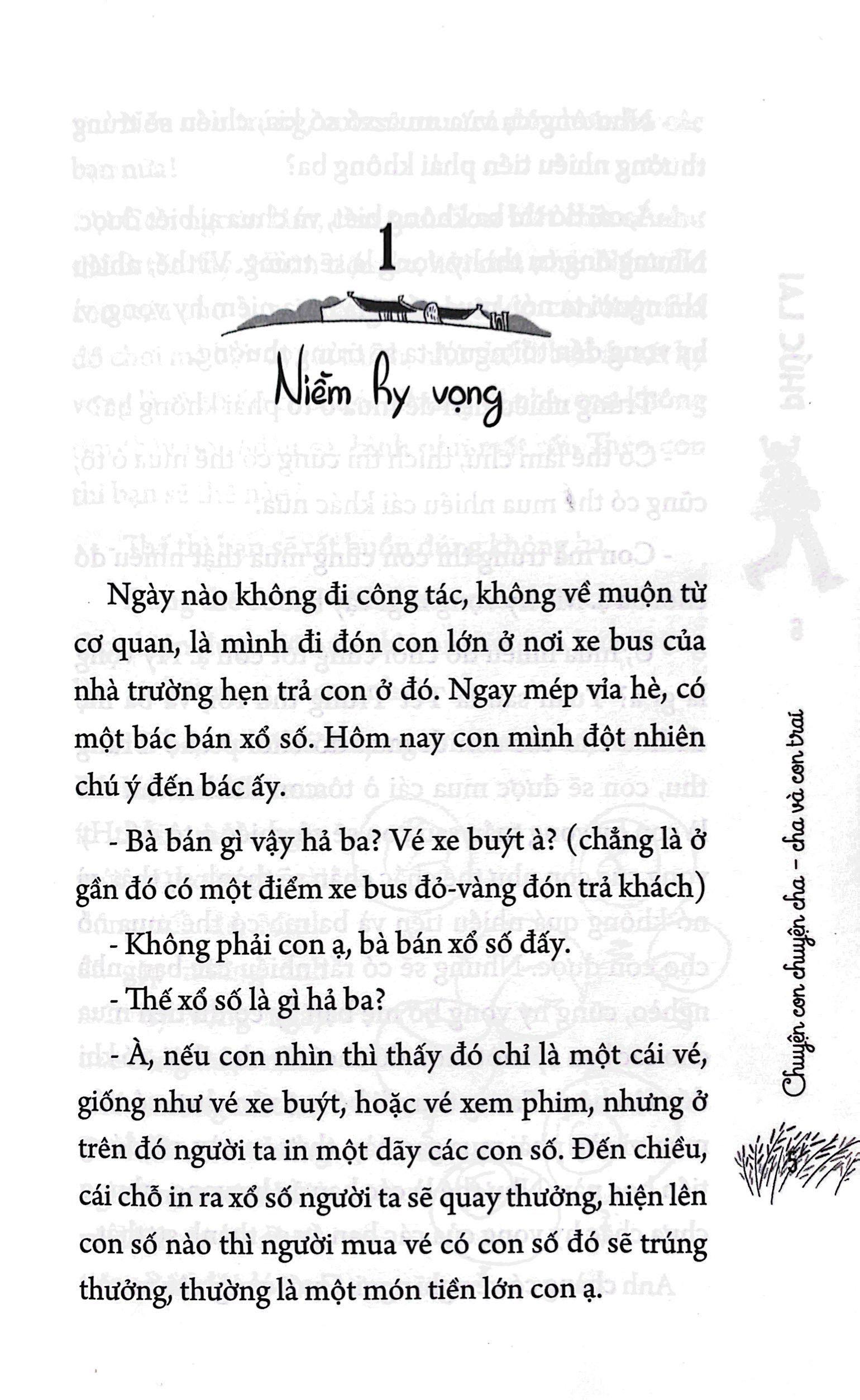 Chuyện con chuyện cha - Cha và con trai giống như một cuốn nhật ký đầy yêu thương ghi lại những cuộc chuyện trò như lời thủ thỉ của người cha với con trai. Tác giả chỉ nhẹ nhàng viết về những chuyện lặt vặt hàng ngày, ăn cơm, học bài, trong nhà và ngoài đường phố nơi công cộng, nhưng lại khéo léo gửi gắm những bài học nho nhỏ về đạo đức, lòng dũng cảm, cách sống chân thực, thẳng thắn, lối cư xử lễ phép, tế nhị, văn hóa,… cùng niềm mong mỏi các con m.ình sẽ trở thành người biết quan tâm, yêu lao động, có ích cho xã hội.