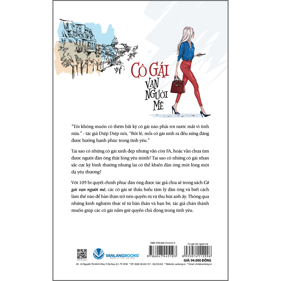“Tôi không muốn có thêm bất kỳ cô gái nào phải rơi nước mắt vì tình nữa.” - sách tác giả Diệp Diệp nói, “Bởi lẽ, mỗi cô gái sinh ra đều xứng đáng được hưởng hạnh phúc trong tình yêu.” Tại sao có những cô gái xinh đẹp nhưng vẫn còn FA, hoặc vẫn chưa tìm được người đàn ông thật lòng yêu mình? Tại sao có những cô gái nhan sắc cực kỳ bình thường nhưng lại có thể khiến đàn ông một lòng một dạ yêu thương? Với 109 bí quyết chinh phục đàn ông được tác giả chia sẻ trong sách Cô gái vạn người mê, các cô gái sẽ thấu hiểu tâm lý đàn ông và biết cách làm thế nào để bản thân trở nên quyến rũ và thu hút anh ấy. Thông qua những kinh nghiệm thực tế từ bản thân và bạn bè, tác giả chân thành muốn giúp các cô gái nắm giữ quyền chủ động trong tình yêu.
