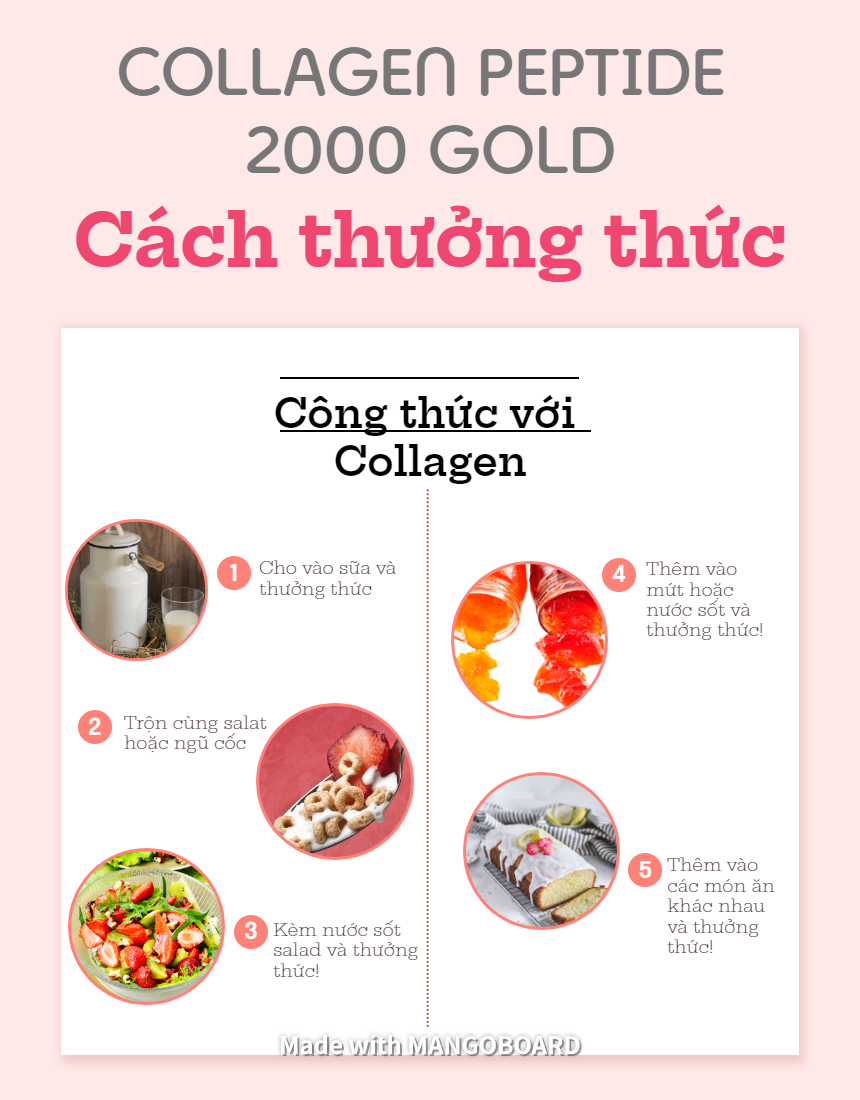 - Đặc biệt: sản phẩm không gây mập Cách sử dụng: dùng mỗi ngày, hàm lượng collagen thủy phân đã được tính toán kĩ lưỡng vừa cho lượng dùng của 1 người/ngày nên có thể uống liên tục mỗi ngày. Có thể dùng trực tiếp hoặc bỏ vào nước uống, thức ăn Quy cách đóng gói: Đóng gói: 2 g/ gói; 2 g x 30 gói/ hộp; 2g x 30 gói/ hộp nhỏ x 3 hộp nhỏ / hộp lớn (Khối lượng trung bình 2 g/ gói ± 7.5%)