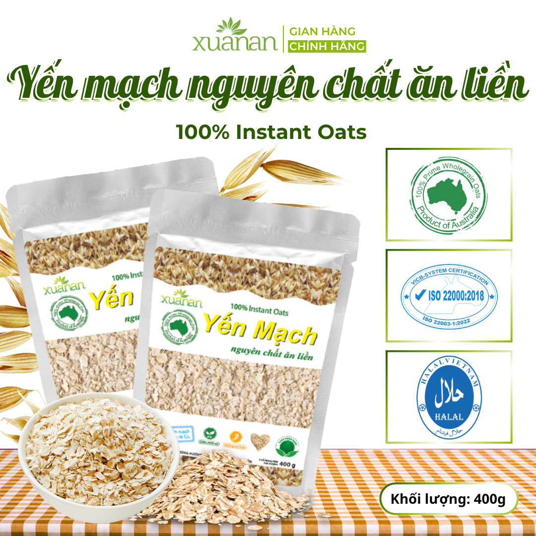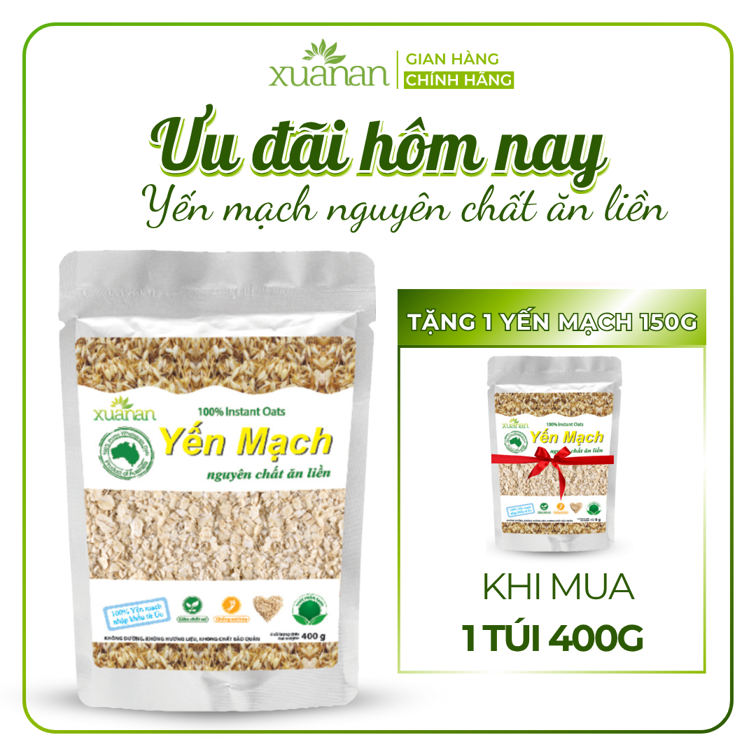COMBO 11 TÚI YẾN MẠCH NGUYÊN CHẤT ĂN LIỀN – TÚI 400G Yến mạch là loại ngũ cốc giàu chất xơ, giàu đạm, vitamin và dưỡng chất tự nhiên. Yến mạch nguyên chất Xuân An (Instant Oats) 100% được nhập khẩu từ ÚC. Thành phần : 100% Yến mạch nguyên chất nhập khẩu từ Úc. Không chất bảo quản, không hương liệu, không phụ gia. Sử dụng Yến mạch hằng ngày giúp giảm nguy cơ tim mạch, tiểu đường, giảm lượng cholesterol trong máu. Phòng tránh bệnh loãng xương, ung thư, béo phì, táo bón. Giúp tăng khả năng tập trung, tránh suy nhược thần kinh, cũng cố hệ miễn dịch. Yến mạch có khả năng chống viêm và làm lành các vết thương trên da. Mặt nạ yến mạch làm sạch da và mịn da, dưỡng chất saponin giúp chống lão hóa hiệu quả. Đối tượng sử dụng : Thích hợp với mọi lứa tuổi. Tốt cho người ăn kiêng, tiểu đường, béo phì và táo bón. Quy cách đóng gói: 400g/túi – 24 túi/thùng Hướng dẫn sử dụng: Dùng ăn liền hoặc làm nguyên liệu chế biến bữa ăn trong gia đình. Pha 30 g yến mạch nguyên chất với 180 ml nước thật sôi, khuấy đều trước khi dùng, có thể thêm đường, sữa  (sữa bột, sữa tươi), hoặc trái cây tuỳ theo sở thích. Dùng nấu cháo: đun sôi khoảng 250 ml nước (cho một ít thịt, tôm, cá, hoặc lươn), nêm gia vị sau đó cho 50g yến mạch đun tiếp trong 3 phút rồi ăn. Bảo quản: Bảo quản nơi khô ráo, thoáng mát; tránh tiếp xúc trực tiếp với không khí và ánh nắng mặt trời. Thông tin cảnh báo: Không dùng khi sản phẩm bị rách, mốc hoặc đã hết hạn sử dụng. Sản phẩm của: Công ty TNHH Thực Phẩm Dinh Dưỡng Xuân An.