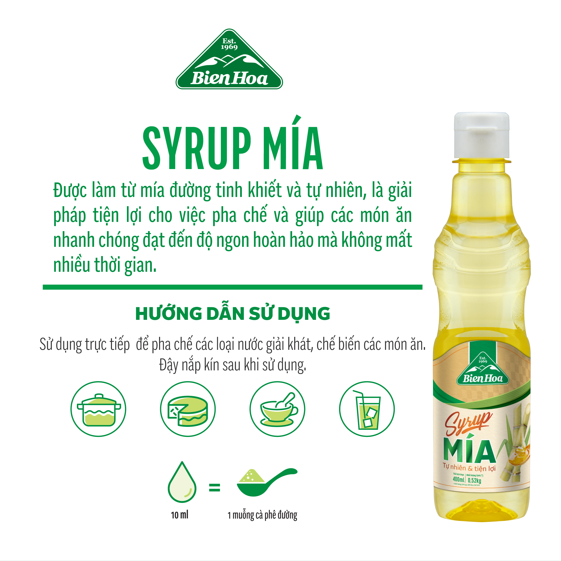 SẢN PHẨM ĐỘC NHẤT, TIÊN PHONG Dễ tan ngay cả trong nước lạnh, giảm tính kết tinh cho các sản phẩm được sản xuất khi dùng. Đường mía lỏng mang vị ngọt đặc trưng của mía đường và có độ ngọt cao hơn so với đường tinh luyện thông thường nhờ có sự hiện diện của đường fructose tự nhiên. HOÀN TOÀN TỰ NHIÊN: Nguyên liệu là đường tinh luyện chất lượng cao;  Sản phẩm được sản xuất hoàn toàn bằng phương pháp hữu cơ, không hóa chất phụ gia, TIÊU CHÍ 03 KHÔNG: Không phẩm màu. Không hóa chất phụ gia và chất tạo ngọt nhân tạo Không hình thành HMF ( Hydroxy Methyl Furfurol) là chất độc gây ung thư. SỰ TIỆN LỢI, BẢO QUẢN : Sản phẩm đóng chai tiện lợi, có thể mua dể dàng ở các cửa hàng trên toàn quốc. Dễ dàng lưu trữ, bảo quản mà không làm mất đi vị ngon của sản phẩm và sử dụng bất kể thời điểm bạn muốn. KINH TẾ – TIỆN DỤNG – TIẾT KIỆM Đậm Đà Hơn Tiện Lợi Hơn. Tiết Kiệm Hơn
