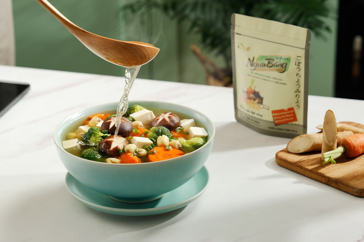 Thành phần: muối, ngưu báng 30%, nấm đông cô, cà rốt, protein đậu nành, chiết xuất lúa mạch, đường vàng.