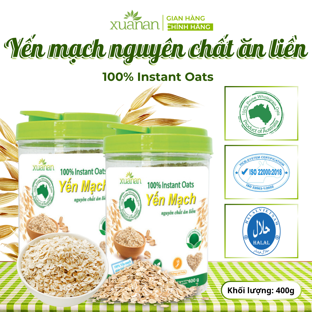 YẾN MẠCH NGUYÊN CHẤT ĂN LIỀN – TÚI 400G Yến mạch là loại ngũ cốc giàu chất xơ, giàu đạm, vitamin và dưỡng chất tự nhiên. Yến mạch nguyên chất Xuân An (Instant Oats) 100% được
