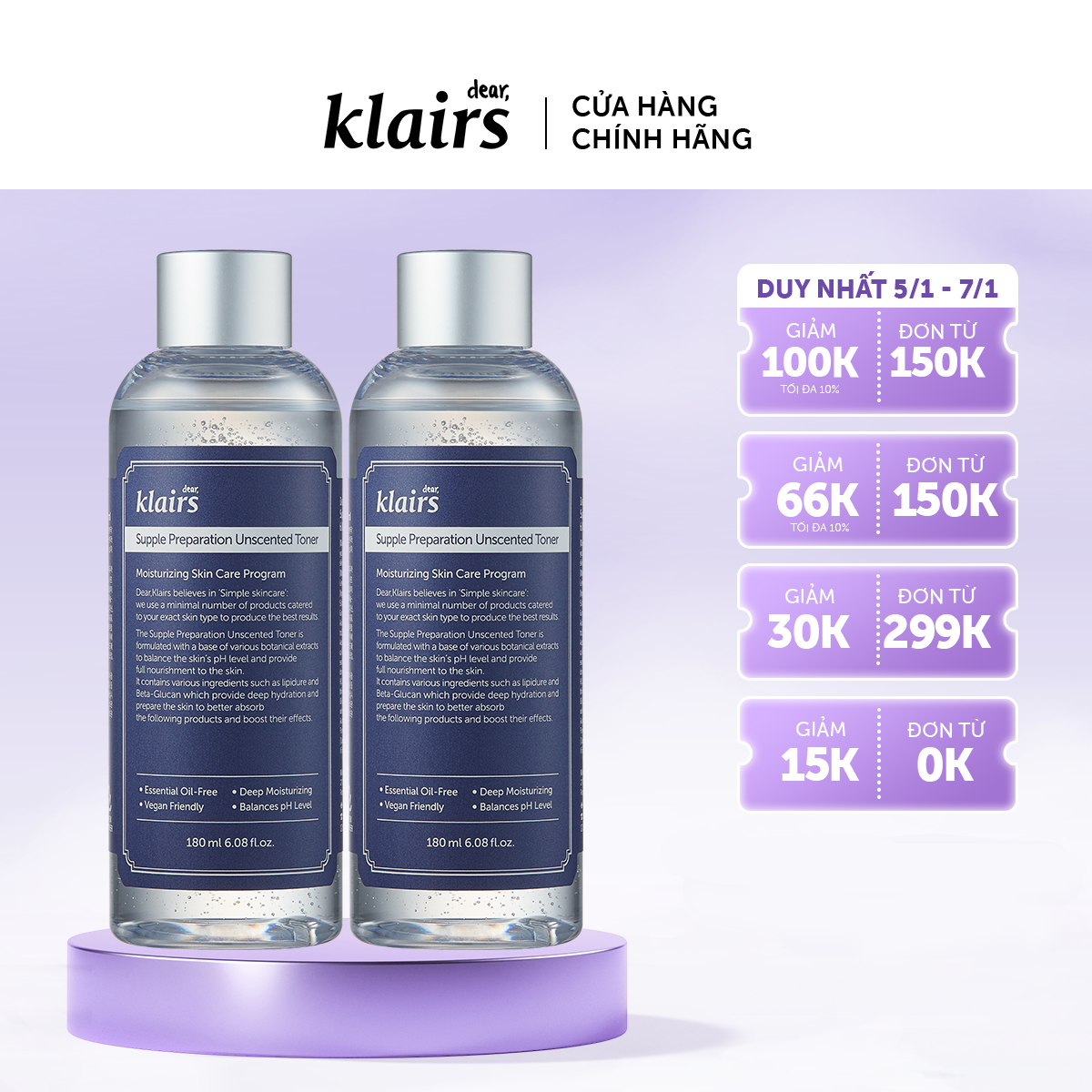 ✨Combo 2 Nước hoa hồng Dear, Klairs Supple Preparation Unscented Toner 180ml