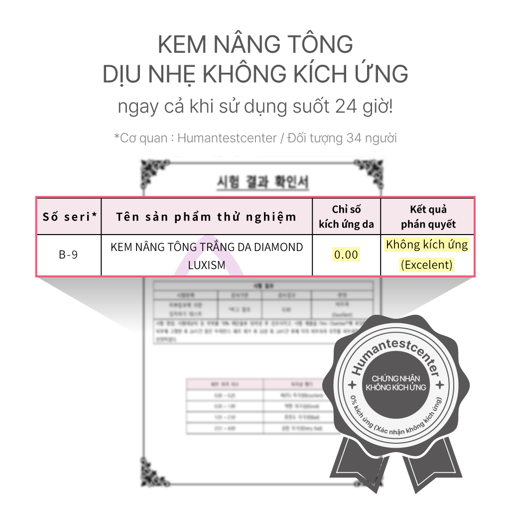 - Bất kỳ ai có tông màu da không đồng đều Có được làn da sáng, rạng rỡ một cách nhanh chóng và tự nhiên với Luxism Diamond White Tone-Up Cream. Trải nghiệm làn da tươi sáng, tự tin hơn mỗi ngày. Hãy để một sản phẩm này hoàn thành quy trình chăm sóc da của bạn! Đặt hàng ngay bây giờ và cảm nhận sự khác biệt cho chính mình! Tên sản phẩm Kem dưỡng trắng da Diamond Luxism Thành phần NƯỚC, GLYCERIN, DIMETHICONE, BUTYLENE GLYCOL, TITANIUM DIOXIDE, NIACINAMIDE, SODIUM ACRYLATE/SODIUM ACRYLOYLDIMETHYL TAURATE COPOLYMER, 1,2-HEXANEDIOL, CAPRYLIC/CAPRIC TRIGLYCERIDE, ISOHEXADECANE, POLYSORBATE 80, DIMETHICONE, CANDIDA BOMBICOLA/GLUCOSE/METHYL RAPESEEDATE FERMENT, CAPRYLYL GLYCOL, ORYZA SATIVA (DẦU MẦM GẠO), ALLANTOIN, DIMETHICONOL, ALUMINUM HYDROXIDE, SORBITAN OLEATE, ETHYLHEXYLGLYCERIN, TRIETHOXYCAPRYLYLSILANE, ADENOSINE, CAMELLIA SINENSIS (CHIẾT XUẤT LÁ TRÀ XANH), CITRUS SINENSIS (TINH DẦU VỎ CAM), SODIUM HYALURONATE, CITRUS AURANTIUM BERGAMIA (TINH DẦU CAM BERGAMOT), CITRUS RETICULATA (TINH DẦU VỎ QUÝT), HYALURONIC ACID, HYALURONIC ACID THỦY PHÂN, HYALURONIC ACID SODIUM, HYALURONATE THỦY PHÂN, HYALURONATE SODIUM, POTASSIUM HYALURONATE, SODIUM ACETYLATED HYALURONATE, DISODIUM EDTA, FRAGRANCE, ALPHA-ISOMETHYL IONONE, HEXYL CINNAMAL, LIMONENE, LINALOOL Cảnh báo Lưu ý khi bảo quản và sử dụng: a) Tránh xa tầm tay trẻ em. b) Bảo quản tránh ánh nắng trực tiếp.