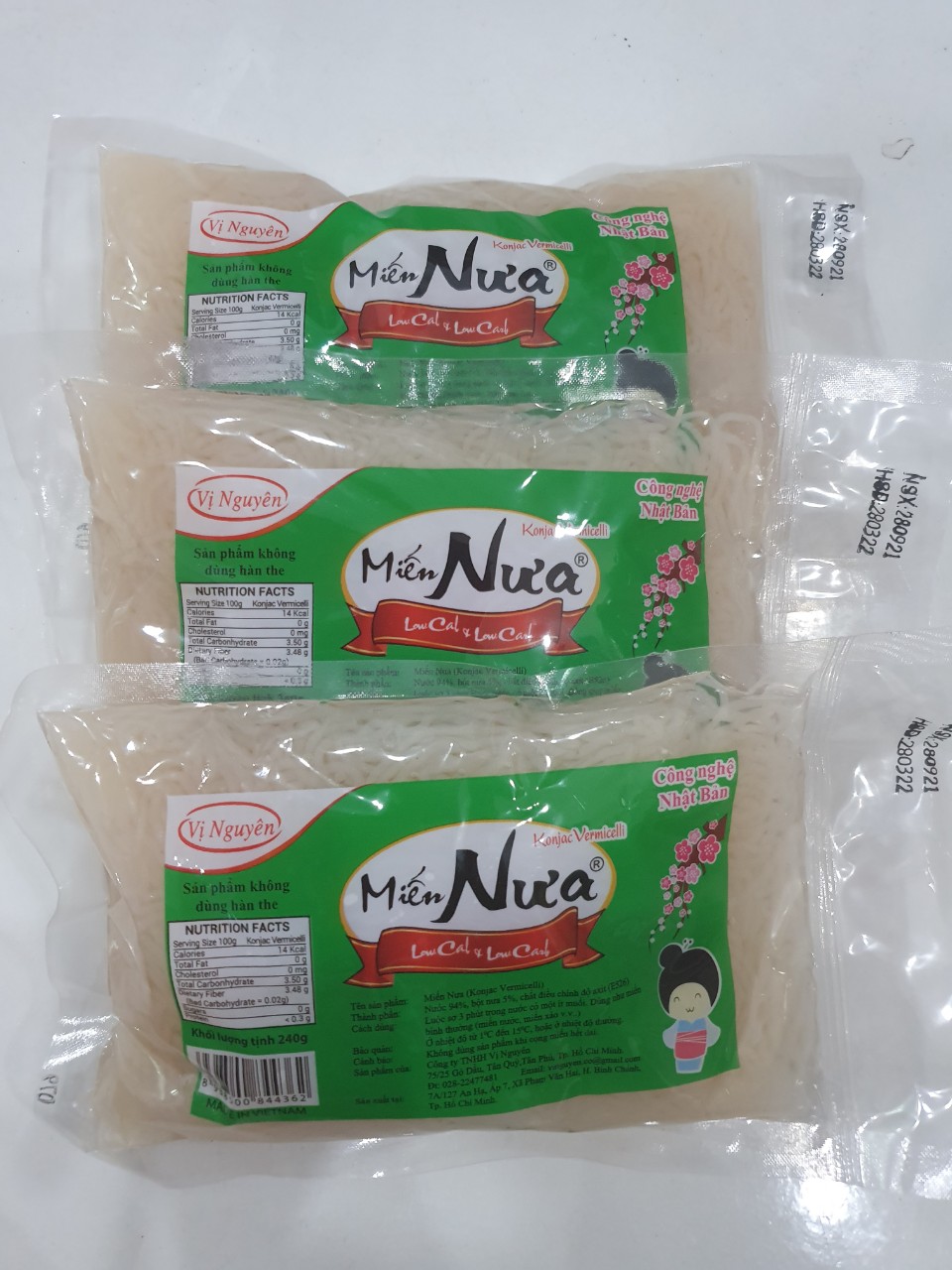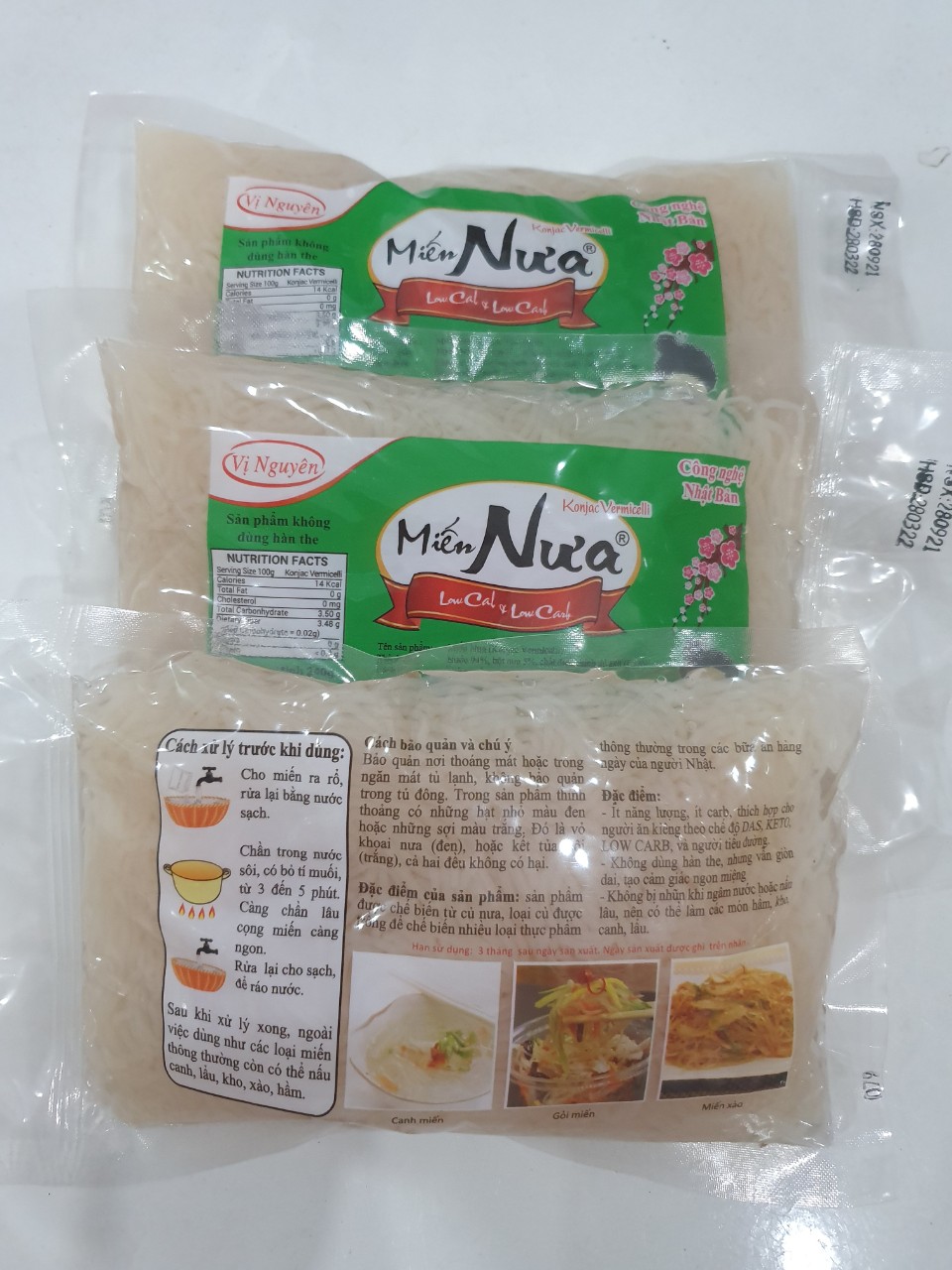 - Bảo quản: Nơi thoáng mát Những thực phẩm được làm từ bột Glucomanna có trong củ nưa, một chất xơ chứ không phải là tinh bột. Sản phẩm được sản xuất theo công nghệ Nhật Bản, không chất bảo quản. ️ THÀNH PHẦN: Miến nưa chiếm 97% chất xơ. Năng lượng 5-30kCal/100g ️ Cách sơ chế: mở hộp đổ bỏ nước muối ngâm, rửa qua bằng nước, thả vào nước sôi cho sôi lại 3-5′. Sau đó có thể chế biến đa dạng như miến bình thường như làm Miến trộn, Miến xào, hoặc Miến nước, đặc biệt ăn lẩu với Miến cực chuẩn, vì đặc trưng của em nó là càng nấu lâu càng ngấm gia vị, đặc biệt là không hề trương hay nhũn, luôn luôn dai ngon. Miến có hàm lượng chất xơ rất cao, là loại củ có thành phần dinh dưỡng là 0 carb from sugar và gần như 0 kcal. phù hợp với mọi lứa tuổi, mọi chế độ ăn kiêng, kể cả DAS, Lowcarb.
