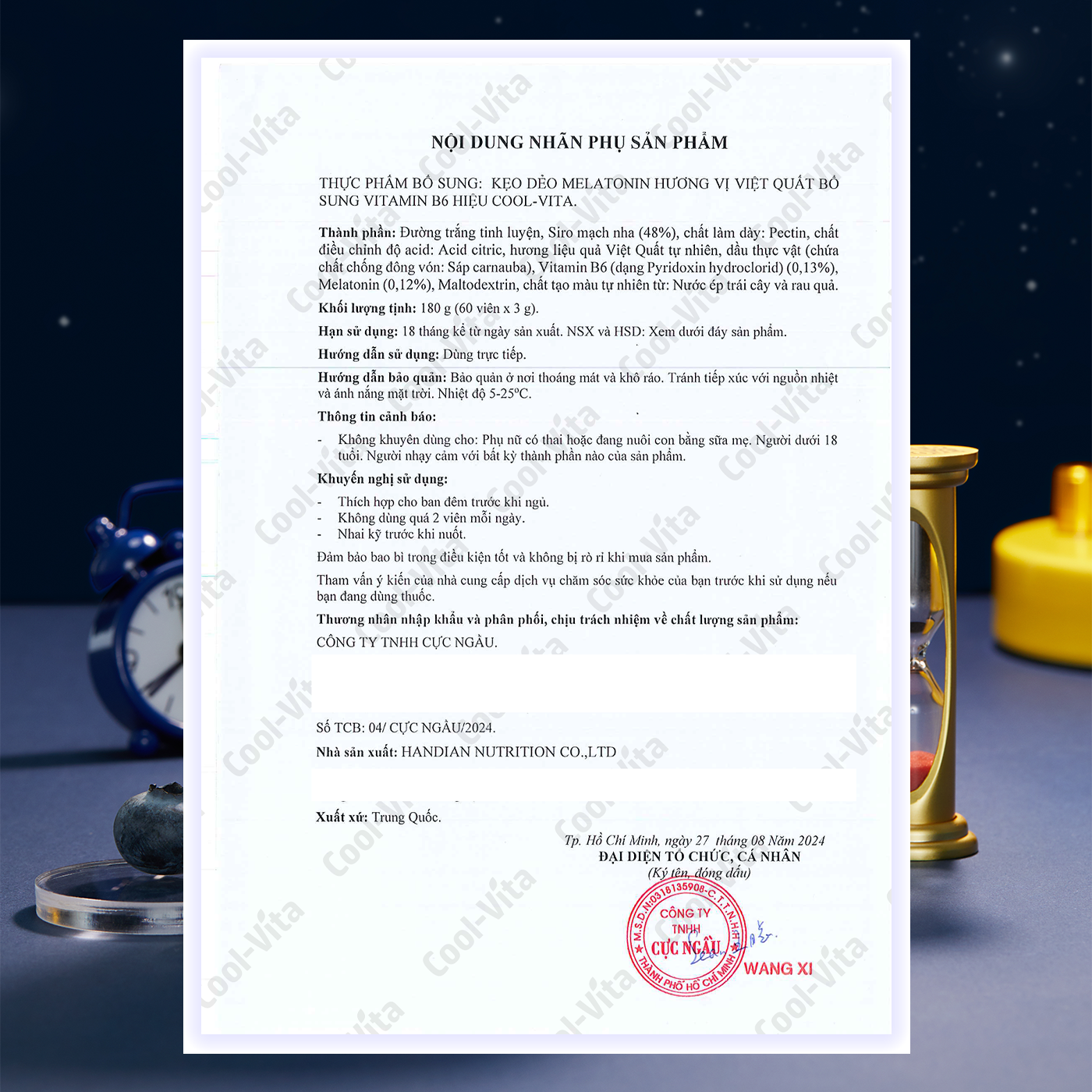 Combo 3 Hộp Kẹo Dẻo Melatonin Giúp Cải Thiện Giấc Ngủ & Giảm Căng Thẳng Vị Việt Quất Kết Hợp Vitamin B6 CoolVita – (60 viên x 3g)/hộp Bạn đang gặp khó khăn khi đi vào giấc ngủ? Vậy thì đừng nên bỏ qua Kẹo Dẻo Melatonin Vị Việt Quất của CoolVita! Kẹo Dẻo Melatonin CoolVita Vị Việt Quất Kết Hợp Vitamin B6 hỗ trợ điều chỉnh chu kỳ giấc ngủ và hỗ trợ cải thiện chất lượng giấc ngủ ngon hơn. Với 6mg melatonin trong mỗi 2 viên kẹo, kết hợp cùng vitamin B6 hỗ trợ giảm căng thẳng, có một đêm ngủ ngon và sâu hơn. Công dụng nổi bật: Hỗ trợ cải thiện chất lượng giấc ngủ: Mỗi 2 viên kẹo dẻo chứa 6mg Melatonin kết hợp Vitamin B6 hỗ trợ điều chỉnh chu kỳ giấc ngủ tự nhiên, giúp bạn dễ dàng đi vào giấc ngủ và duy trì giấc ngủ sâu suốt đêm. Hỗ trợ giúp thư giãn trước khi ngủ: Vitamin B6 giúp tạo cảm giác thư giãn trước khi ngủ, giúp cơ thể dễ dàng đi vào giấc ngủ. An toàn và lành mạnh: Kẹo Dẻo Melatonin CoolVita không phải là thuốc ngủ, hỗ trợ bạn ngủ ngon hơn. Nguyên liệu từ thực vật: Được làm bằng pectin từ thực vật thay vì gelatin, sản phẩm an toàn cho sức khỏe và phù hợp với chế độ ăn chay.   Đặc điểm sản phẩm: Hương vị thơm ngon: Vị việt quất chua ngọt dễ chịu, kẹo dẻo mềm mịn, ngon miệng, không gây dính răng. Dễ sử dụng: Sản phẩm được chế biến thành dạng kẹo dẻo nhai tiện lợi. Tiện lợi mang theo: Hộp nhựa nhỏ gọn, dễ dàng mang theo khi đi công tác hoặc du lịch.   Khối lượng tịnh: 180g (60 viên x 3g)   Lưu ý: Đối với người đang sử dụng thuốc, nên tham vấn ý kiến của Bác Sĩ về thành phần của sản phẩm trước khi dùng. Không sử dụng trước hoặc trong khi lái xe. Không sử dụng cho người dưới 18 tuổi, phụ nữ có thai hoặc đang cho con bú. Không sử dụng sản phẩm có dấu hiệu lạ hoặc sản phẩm đã hết hạn sử dụng. Không sử dụng cho người có mẫn cảm với bất kỳ thành phần nào của sản phẩm.   *Sản phẩm này không phải là thuốc và không có tác dụng thay thế thuốc chữa bệnh (Hiệu quả của sản phẩm tùy thuộc vào cơ địa của từng người mà tác dụng sẽ khác nhau) Thực phẩm bổ sung không thể thay thế cho chế độ ăn uống đa dạng và cân bằng hoặc lối sống lành mạnh. Nếu có bất kỳ phản ứng phụ nào xảy ra, hãy ngừng sử dụng sản phẩm này ngay lập tức.   Xuất xứ: Trung Quốc   Thời hạn sử dụng: 18 tháng kể từ NSX