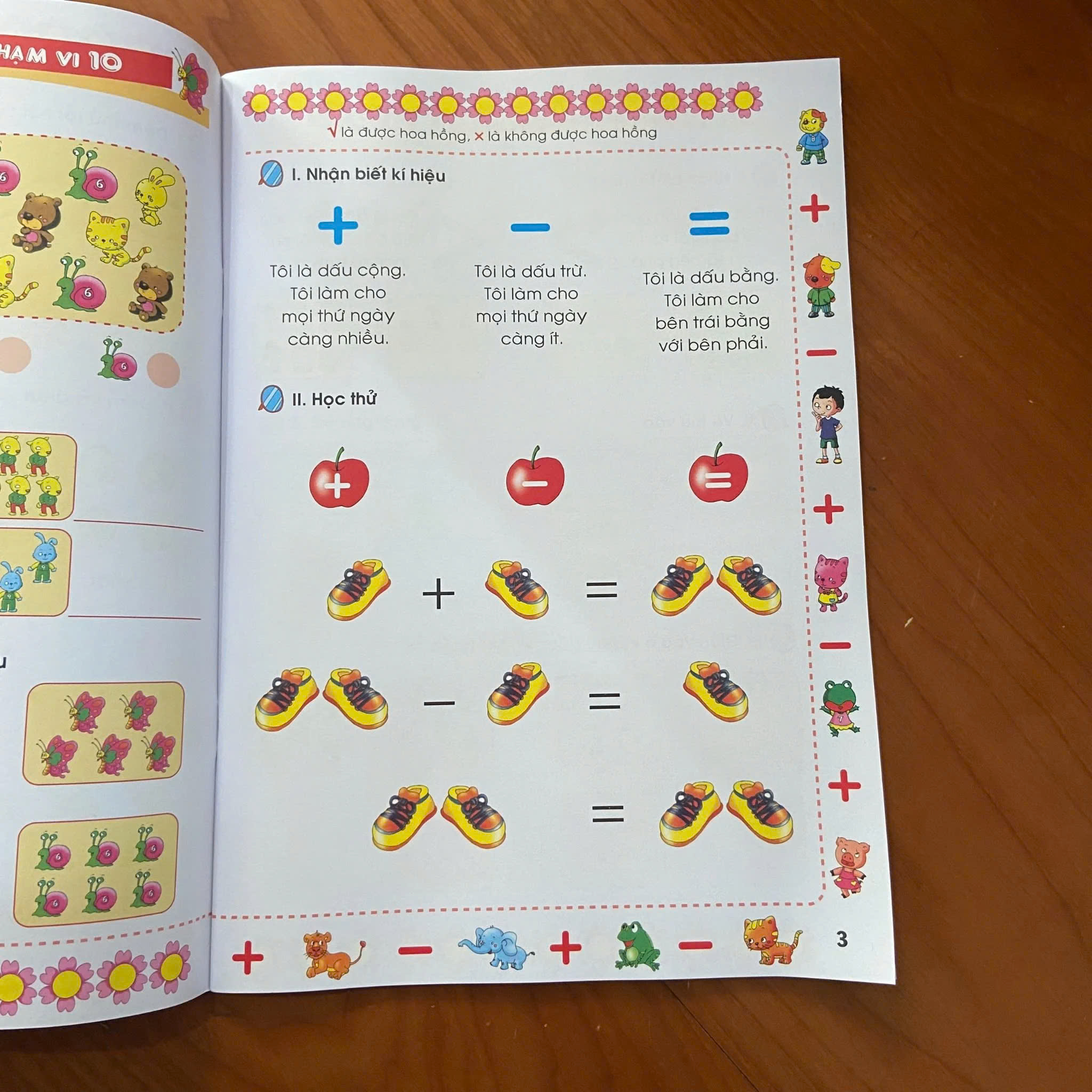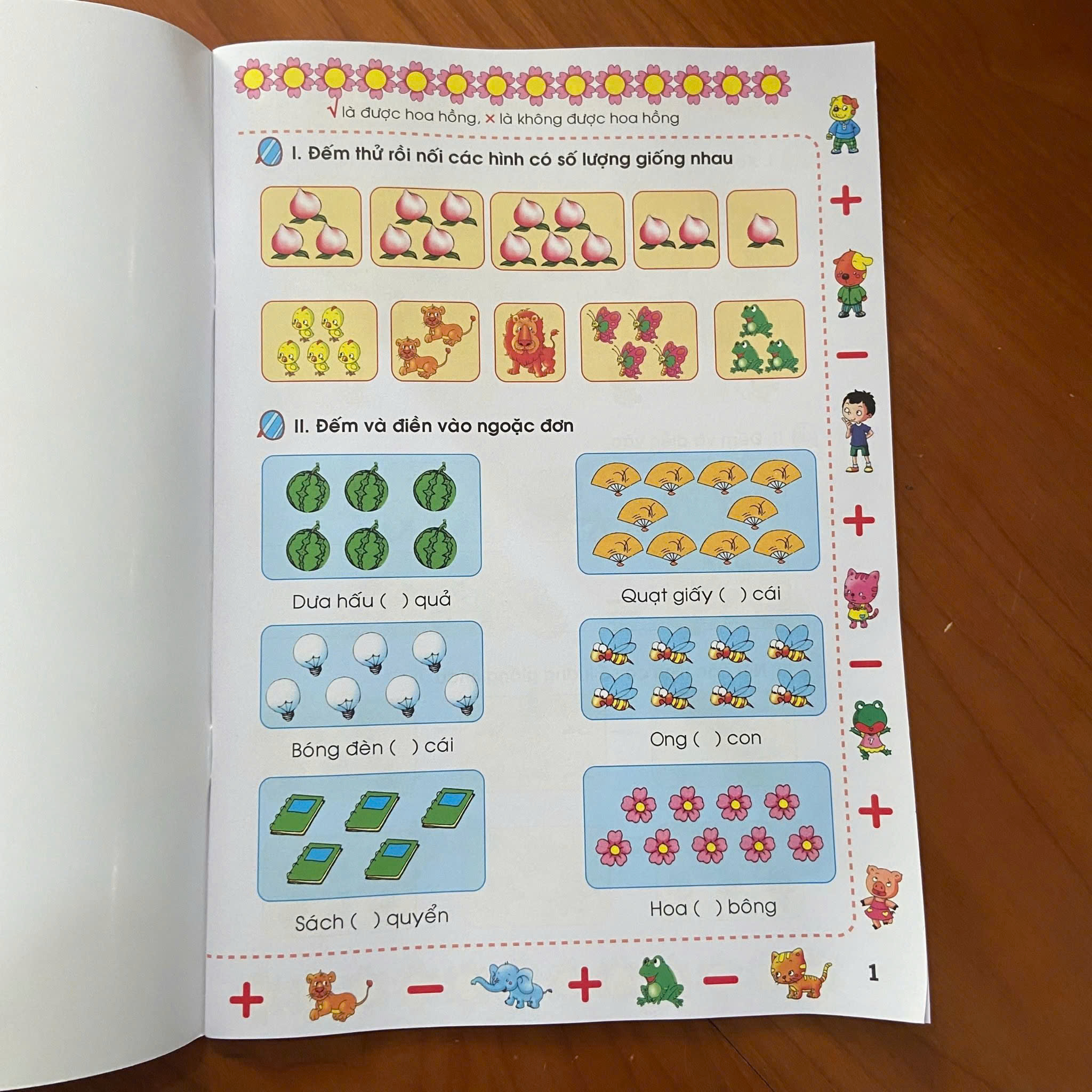 Làm các phép tính trên lưng ốc sên ngộ nghĩnh, trên các lá cây xanh non, các loại hoa quả hấp dẫn và trên chiếc khăn mặt của chú mèo con xinh xắn, ông mặt trời đỏ rực hay quả bóng, chiếc quạt sẽ giúp bé hào hứng hơn việc thực hiện chỉ với con số độc lập đơn thuần. Với việc đưa ra các bài toán, các bé cũng sẽ tìm hiểu thêm nhiều kiến thức thù vị về cuộc sống, ví dụ: ở biển cũng có cua, ngày Tết sẽ treo đèn lồ Tức là, bé không chỉ thực hiện các phép tính mà còn gợi ý nhiều câu hỏi tìm hiểu thú vị để biết thế nào là ngày Tết, mèo thì bắt chuột...