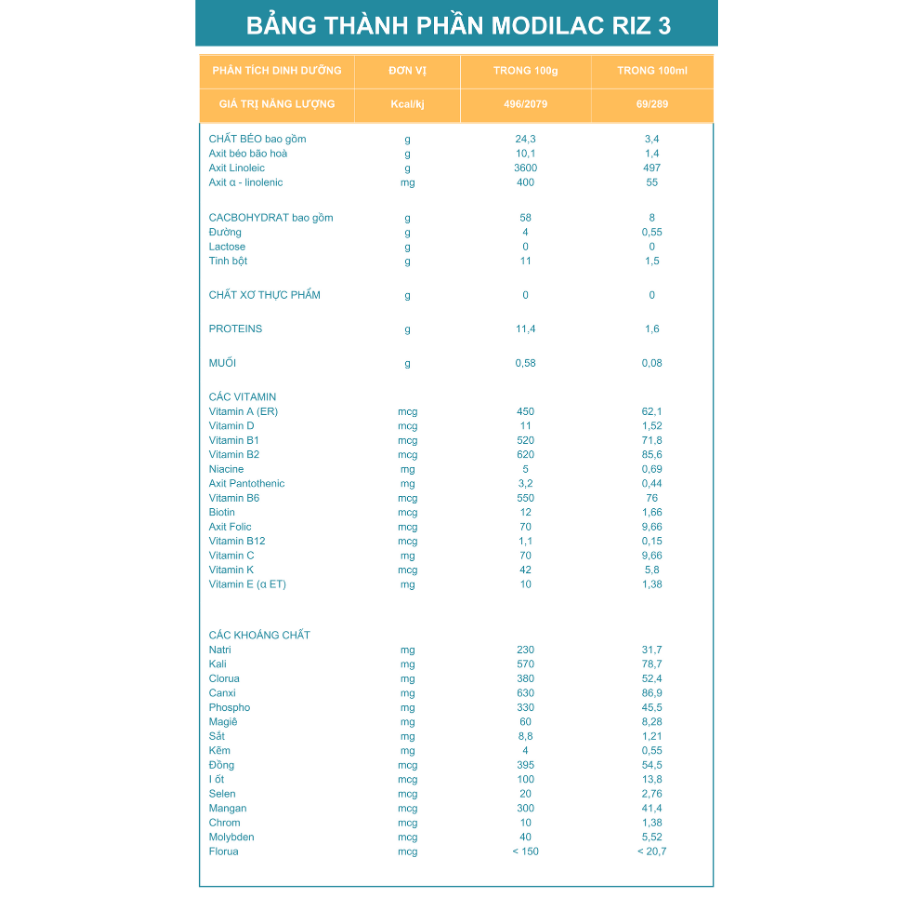Sữa mẹ là thức ăn tốt nhất cho sức khỏe và sự phát triển toàn diện của trẻ sơ sinh và trẻ nhỏ.   Sữa bột cao cấp Modilac Expert Riz 3 dành cho trẻ từ 12 - 36 tháng tuổi được nhập khẩu nguyên hộp từ Pháp   MODILAC EXPERT RIZ DÀNH RIÊNG CHO TRẺ BẤT DUNG NẠP LACTOSE   • Modilac Expert Riz là sản phẩm nội địa Pháp phù hợp khi bị dị ứng đạm sữa bò với đạm gạo thủy phân, không chứa lactose, tăng cường canxi theo khuyến nghị và cung cấp nguồn dinh dưỡng toàn diện. • Modilac Expert Riz hoàn toàn không chứa lactose phù hợp với trẻ bất dung nạp lactose. Là sản phẩm thuộc tập đoàn Savencia (Pháp) với nguồn đạm gạo thủy phân, bổ sung canxi cao (theo khuyến nghị chuyên khoa) và công thức nghiên cứu đặc biệt phù hợp cho trẻ dị ứng đạm bò, bất dung nạp lactose, Modilac Expert Riz là sản phẩm được các ba mẹ tại nhiều nước trên thế giới tin chọn.   6 YÊN TÂM KHI MẸ CHỌN MODILAC SỮA NỘI ĐỊA PHÁP  • Modilac là dòng sữa nội địa cao cấp tại Pháp. • Đầy đủ chứng nhận ISO 9001 & ISO 22000. • Là một trong ít nhãn sữa có viện nghiên cứu riêng. • Mỗi lon sữa Modilac đều được cải tiến không ngừng, phù hợp với sự phát triển của bé. • Trải qua hơn 800 lần xét nghiệm, hơn 200 lượt kiểm tra trước khi đưa ra thị trường. • Là dòng sữa công thức sản xuất bởi tập đoàn Savencia với hơn 60 xây dựng và phát triển. • Modilac Expert Riz là sản phẩm của Tập đoàn Savencia, top 1 về sản xuất bơ sữa tại Pháp, top 5 về sản xuất bơ sữa toàn cầu. Các sản phẩm của Savencia có mặt tại 120 quốc gia.    HƯỚNG DẪN SỬ DỤNG Lưu ý: Xuất xứ: Pháp Hạn sử dụng: 24 tháng Bảo quản sữa bột Modilac ở nơi thoáng mát, khô ráo trước và sau khi mở. Sau khi mở, đóng nắp thật chặt. Sử dụng trong vòng 1 tháng kể từ lần mở hộp đầu tiên.