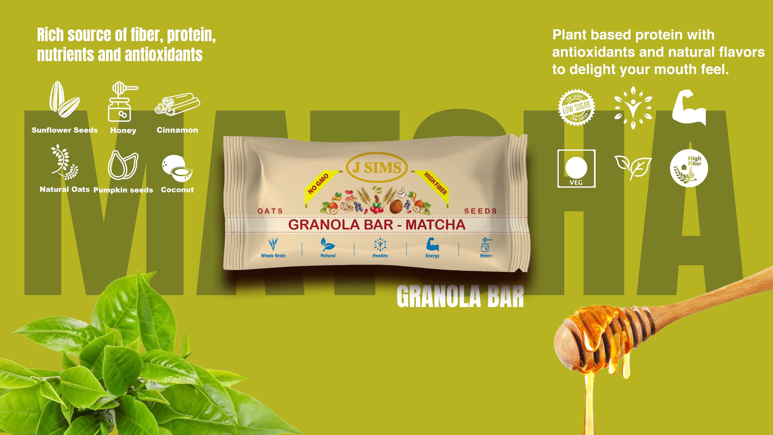 J SIMS Granola Bar Matcha Snack Heathy Nutritious Convenient Snack Just the right type of nutrition, when you have no time for a meal. Plant based nutrition that provides energy for a hard day at work. Our delicious recipes are handcrafted to provide energy and wellness for the health conscious across ages. Using the power of high fibre oats, crispness of seeds, natural sweetness of honey helps us provide functional benefits.