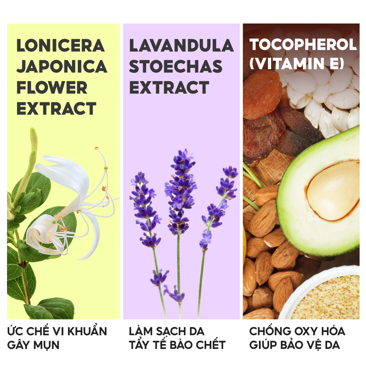 Chiết xuất kim ngân hoa giúp kháng viêm, làm dịu các nốt mụn viêm và ngăn ngừa mụn hiệu quả, phù hợp cho cả làn da nhạy cảm.