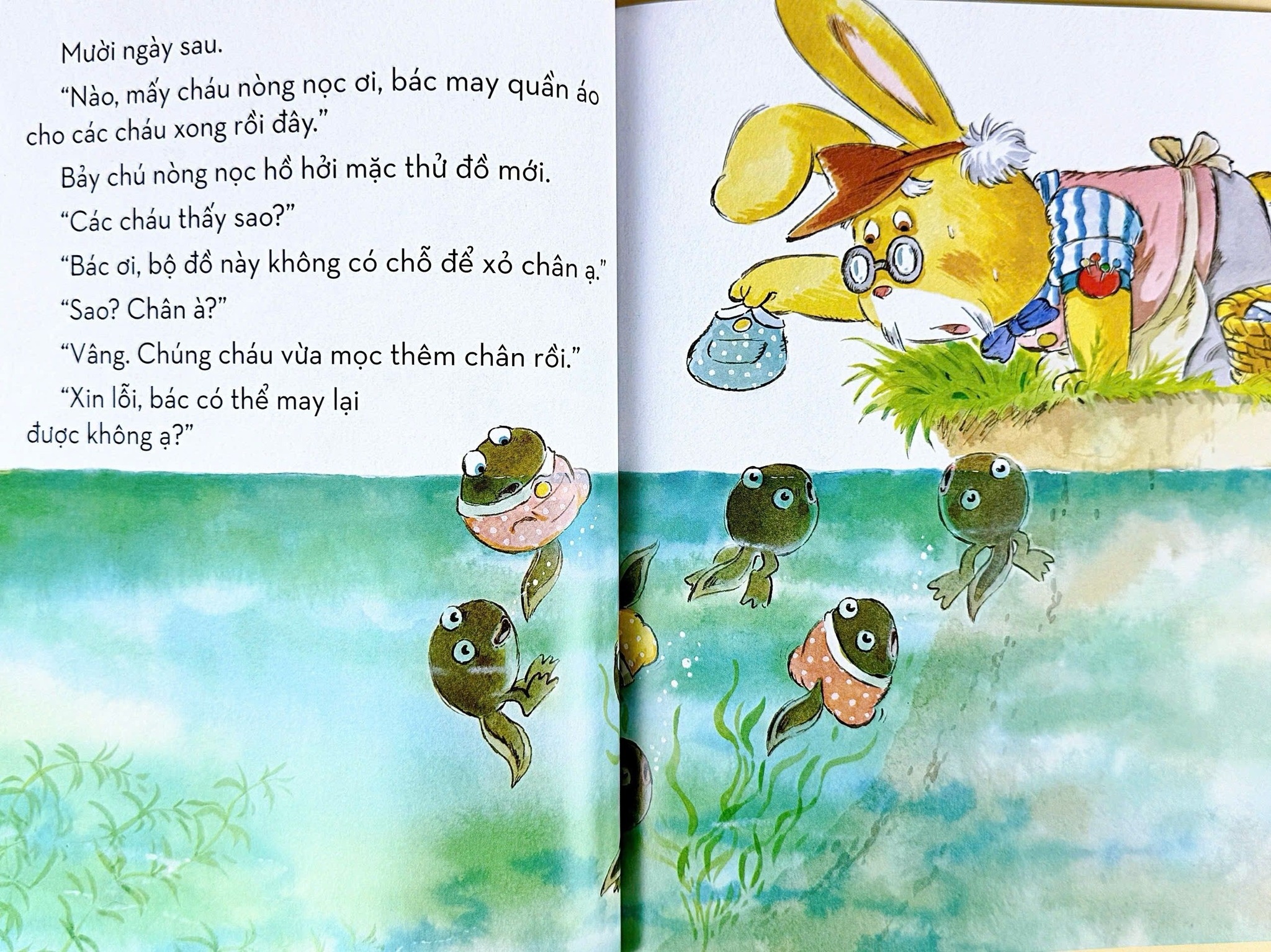Bác Thỏ ngâm cứu ngày đêm, may xong bộ quần áo, có chừa chỗ cho đuôi của nòng nọc. Vậy mà đến lúc 7 anh em mặc vào lại không còn vừa, vì chúng mới mọc thêm chân, bác Thỏ lại mang về sửa. Vài hôm sau, 7 chú thử đồ mới, lại không vừa. Bé có biết vì sao không?