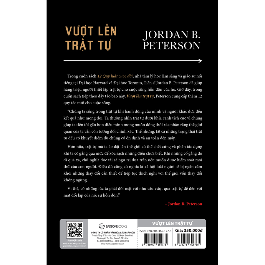 Vậy là cuốn sách tiếp theo Beyond Order – Vượt Lên Trật Tự của Giáo sư Jordan Peterson ra đời như một liều thuốc giải giúp bạn giải quyết những biến động, rối loạn và bất định. Vẫn là 12 quy luật, nhưng khác với “12 rules for life”, 12 bộ quy tắc của Beyond Order như một “cứu cánh” giúp bạn nhận ra rằng trật tự thực ra rất mong manh, rằng “Con người vốn yếu đuối. Vì thế, cuộc sống luôn khó khăn và đau khổ thì đầy rẫy.” Và “để xoa dịu những khổ đau đó (như đảm bảo mọi người đều có đủ thức ăn, nước sạch và một nơi ở đàng hoàng, sạch sẽ), chúng ta cần đến sự mạnh dạn sáng tạo, nỗ lực và năng lực.”