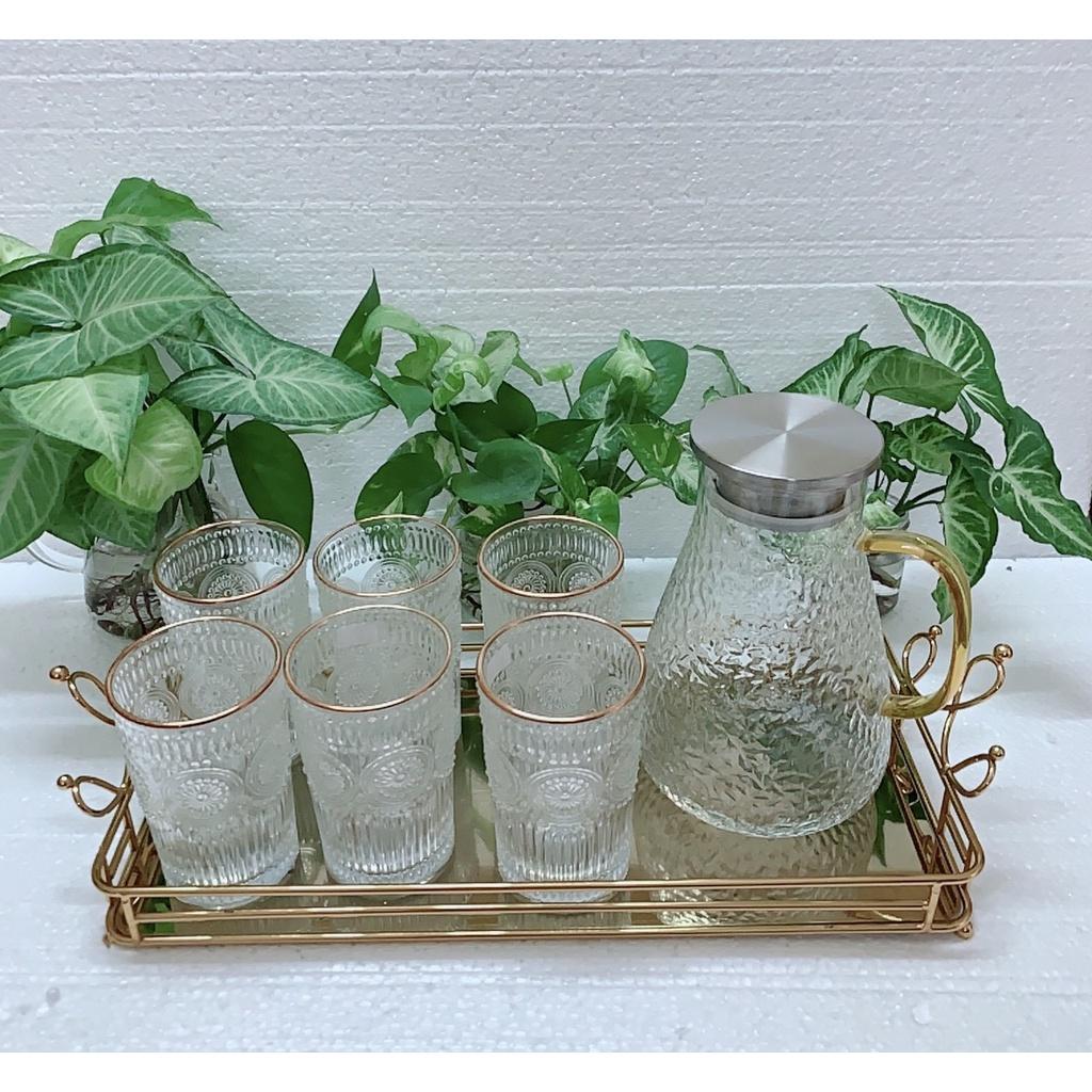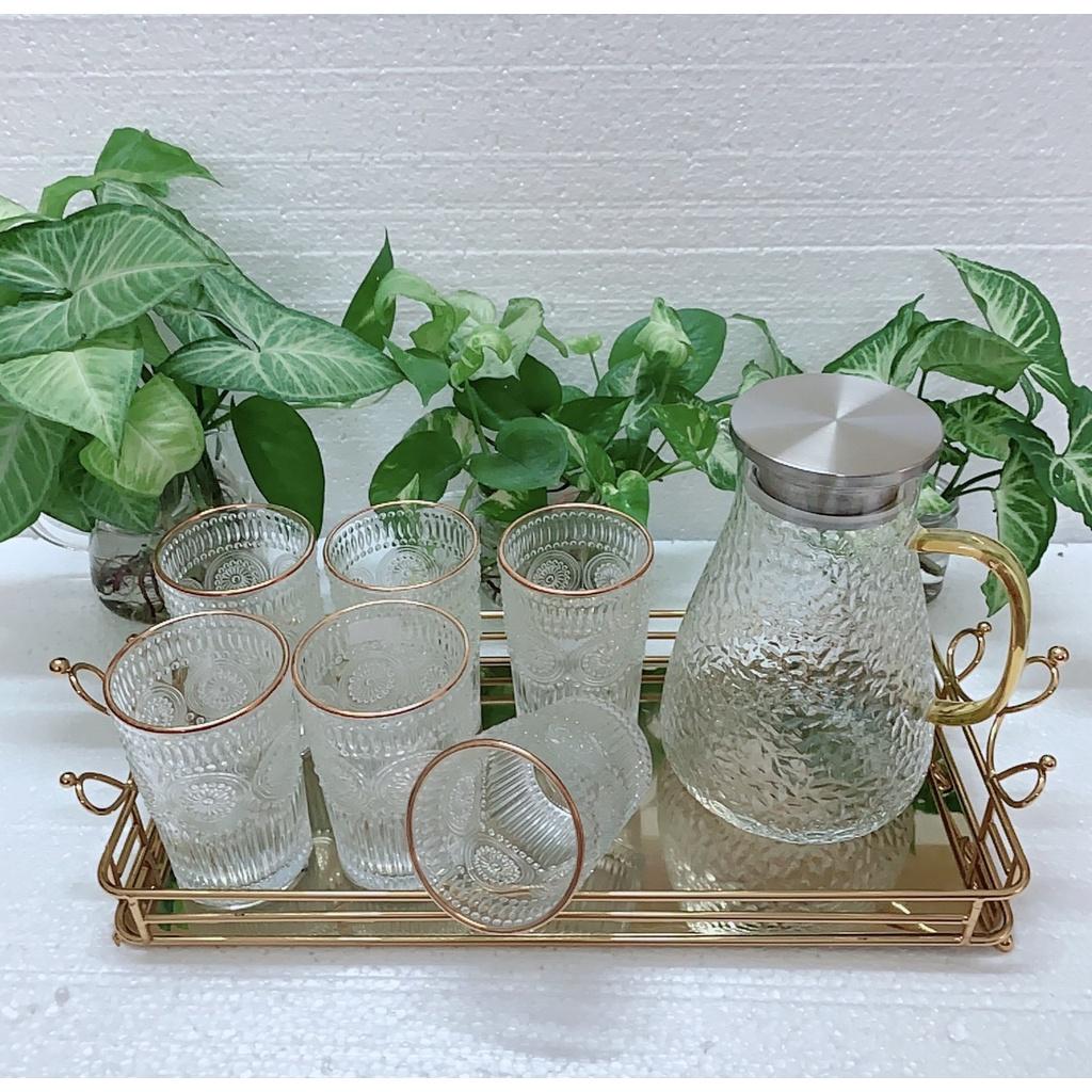 ✨COMBO BỘ BÌNH CỐC THỦY TINH CHỊU NHIỆT LÊN TỚI 400 ĐỘ C KÈM KHAY VƯƠNG MIỆN VÀNG VÀ GIÁ ÚP CỐC ( BÌNH BẦU, CỐC 360ML)