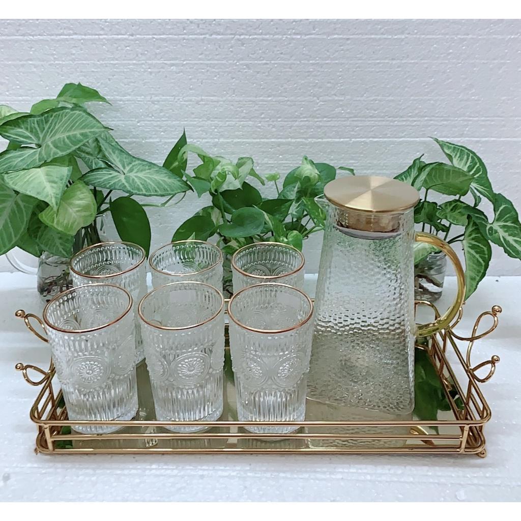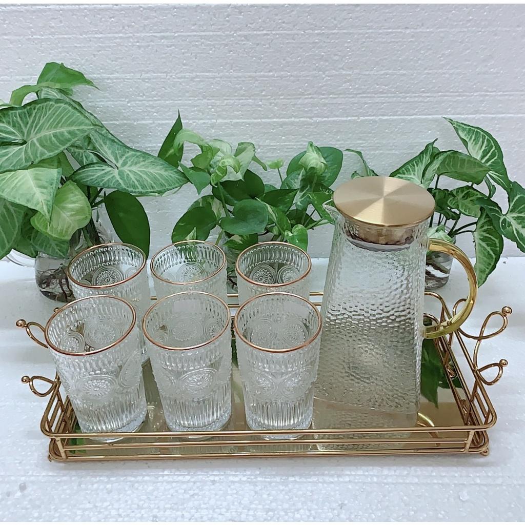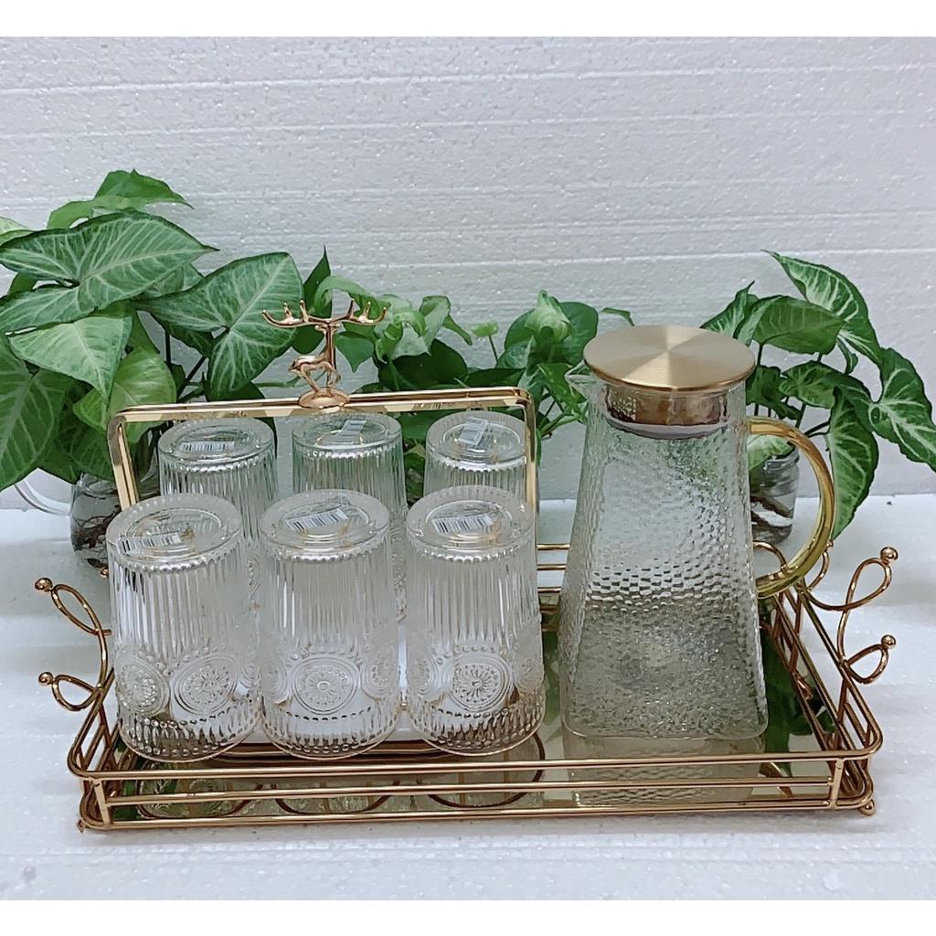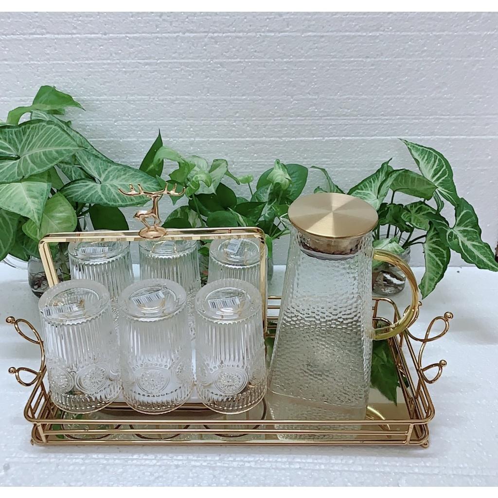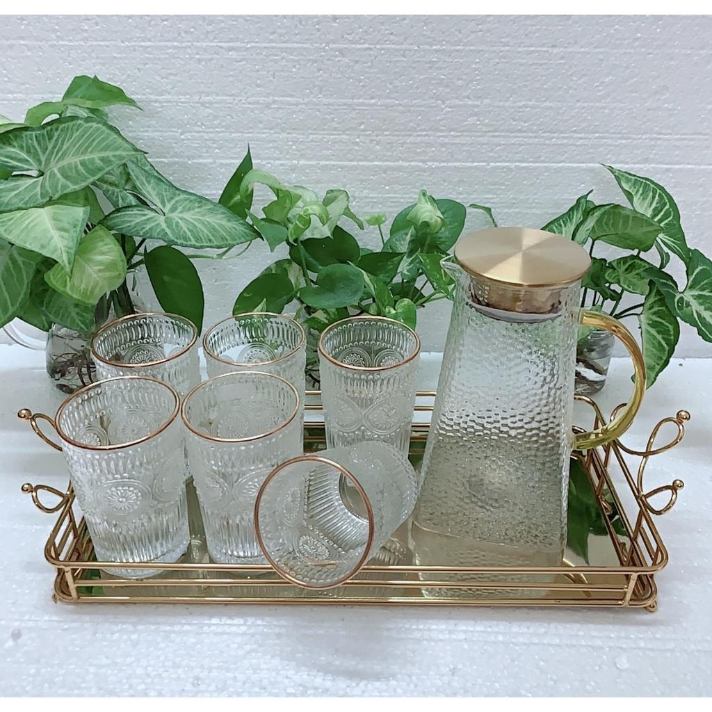 BỘ 6 CỐC KÈM BÌNH THUỶ TINH CÓ KÈM KHAY SIÊU DÀY SIÊU ĐẸP VỀ MẪU NHŨ VÀNG SIÊU HOT! 1 bộ gồm : 1 khay- 1 bình và 6 cốc đều màu nhũ vàng