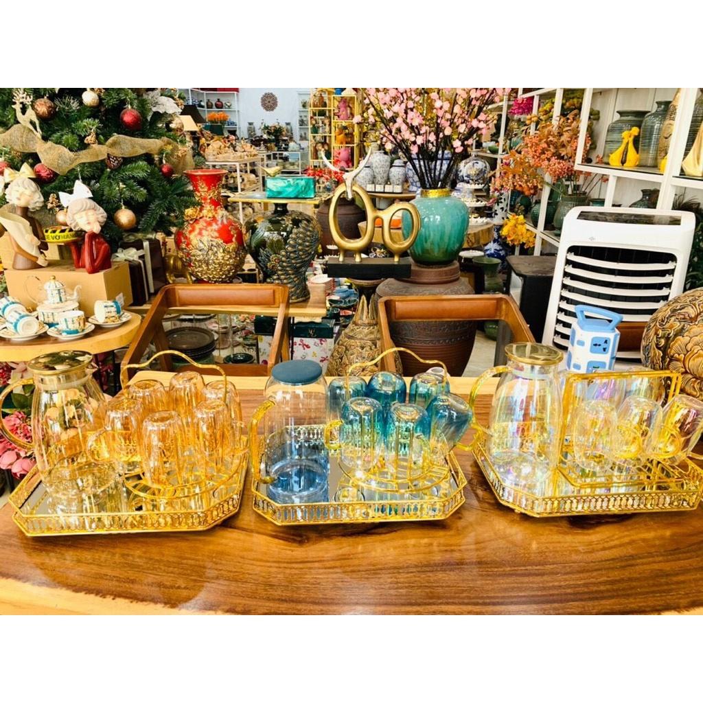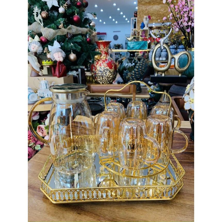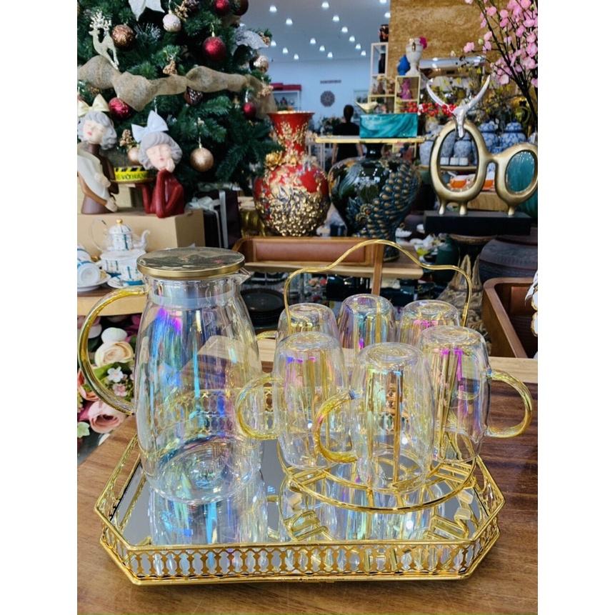✨Combo bộ bình đựng nước thủy tinh cao cấp 6 cốc kèm khay và giá úp mạ vàng