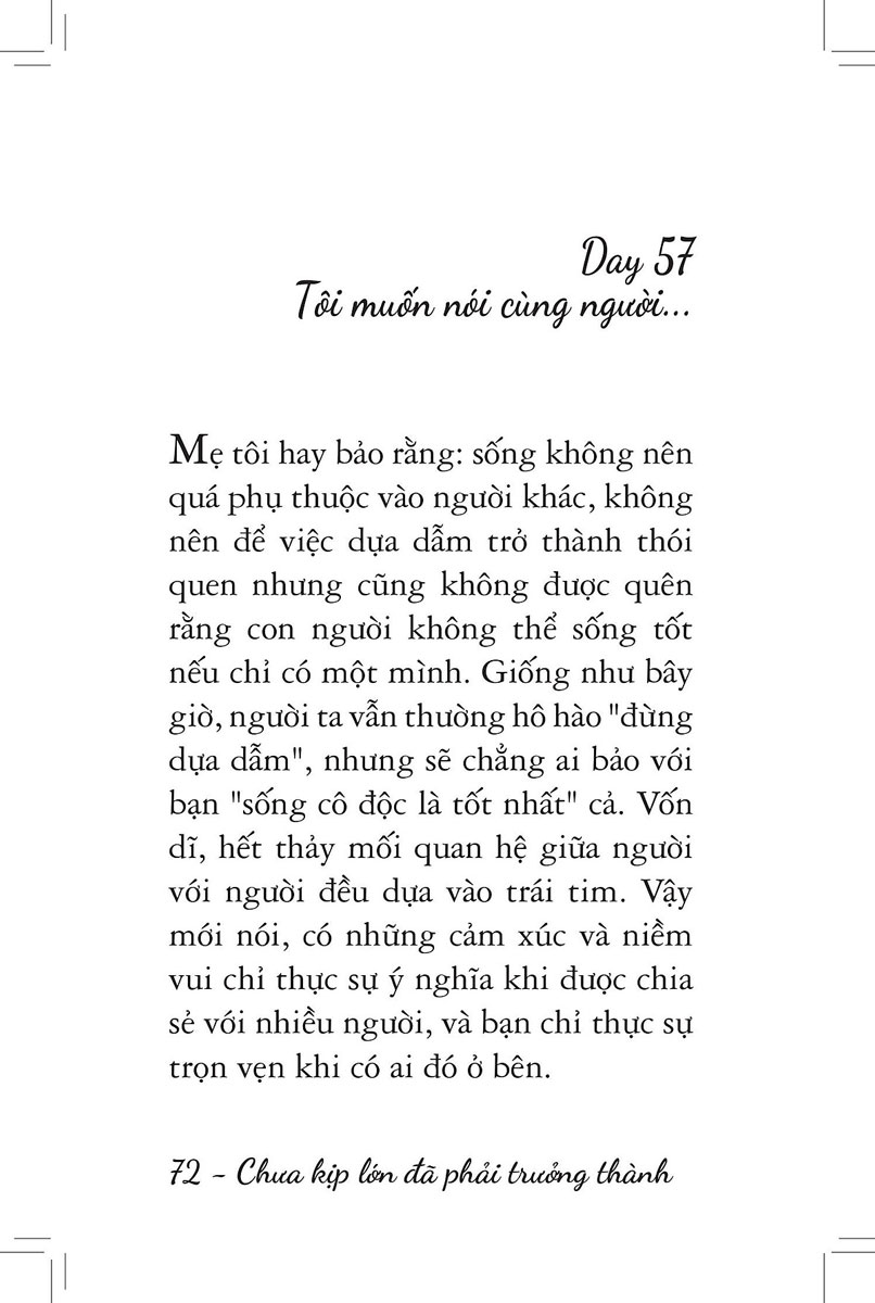 Nếu bạn đang trải qua giai đoạn lạc lõng và cô đơn như vậy, hãy để Chưa Kịp Lớn Đã Phải Trưởng Thành làm một người bạn ở bên, xoa dịu tổn thương và gửi tặng bạn đôi điều khích lệ. Mỗi trang sách đều là một lá thư nhắn nhủ bạn về sự đặc biệt của bản thân, về những nỗ lực hoàn thiện không ngừng nghỉ trong thế giới của người trưởng thành.
