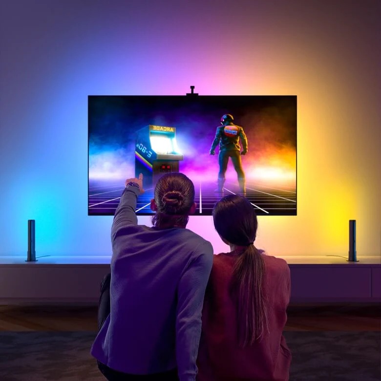 Đặt 2 đèn LED ở 2 bên tivi. Mỗi bên được kết nối thông qua một dây cáp. Thông số kỹ thuật Model: H605B Màu sắc: RGBIC Điều khiển: Điều khiển bằng giọng nói, ứng dụng Govee Home Kết nối: WiFi + Bluetooth Kích thước TV phù hợp: 55-65 inch Chế độ âm nhạc: 4 Chế độ ánh sáng: 32 Số lượng đèn: Thanh ánh sáng + Đèn nền LED TV