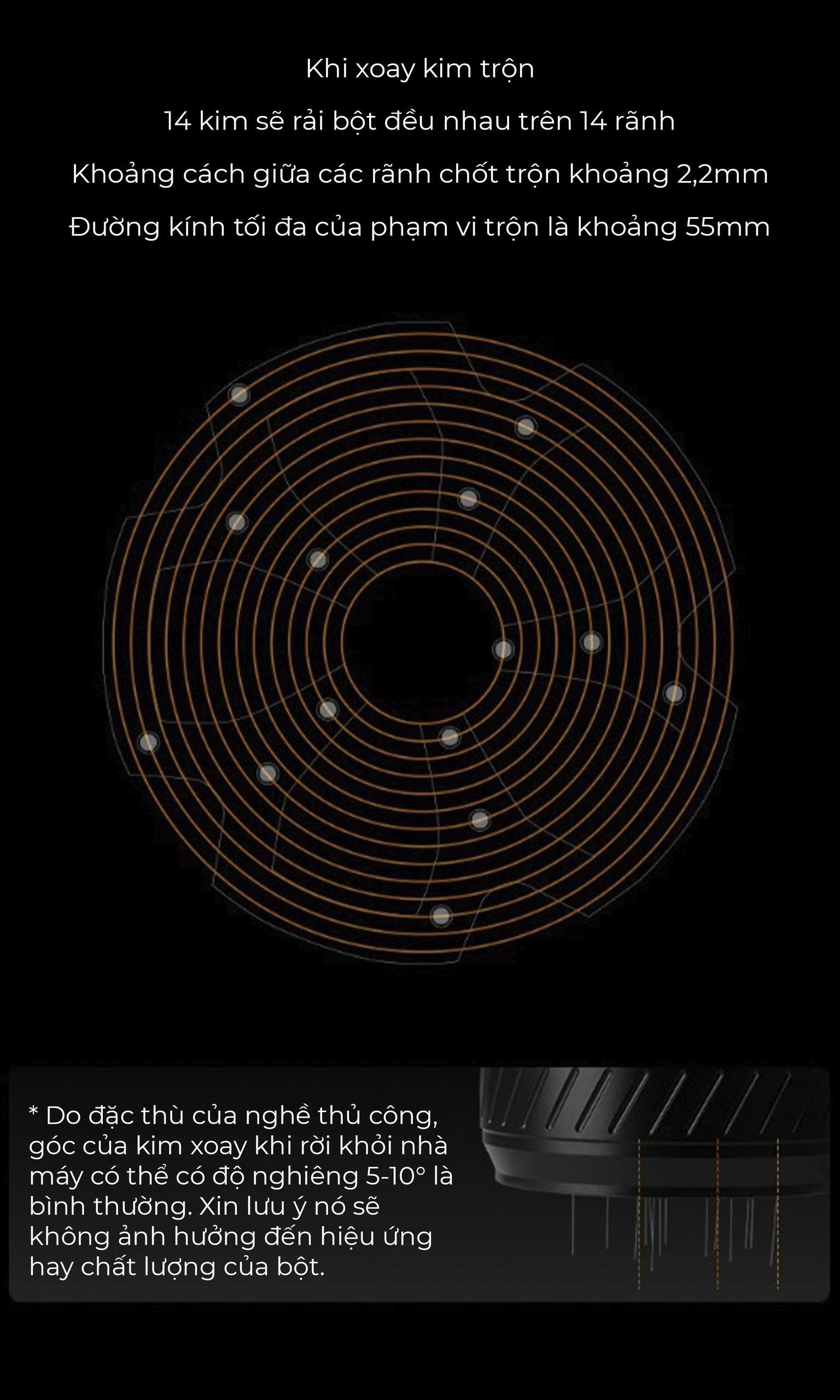 - Kim xoay tán đều bột THOR • Xoắn ốc đều tay – đĩa kim quay tròn khi ấn • Phân bổ bột đồng đều, không vón cục