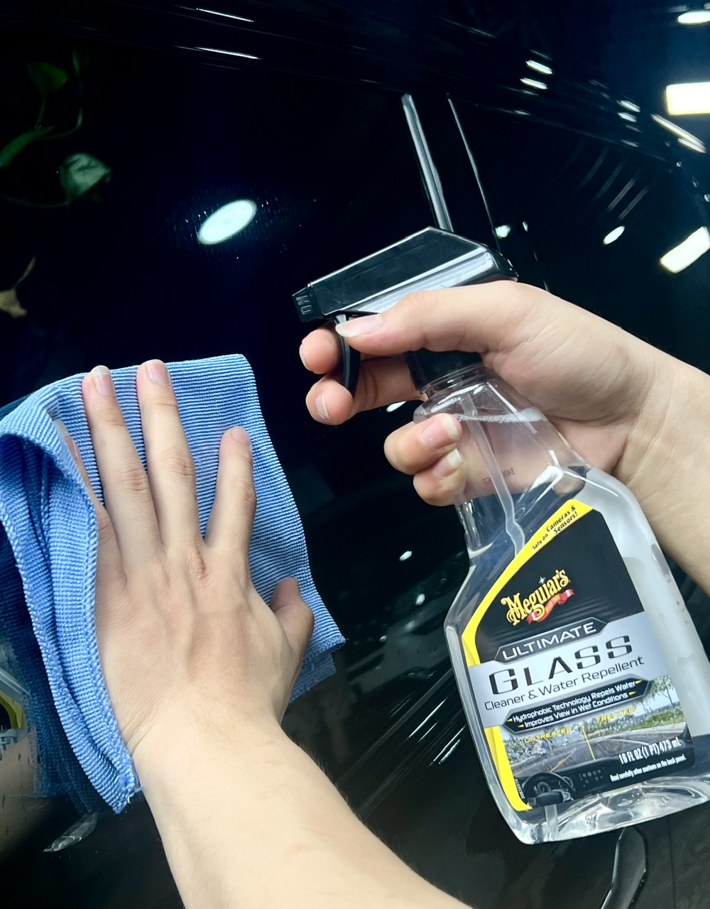 Perfect Clarity Glass Polishing Compound G8408: Xi đánh bóng kính xe ô tô sáng trong suốt • Công nghệ Super Micro-abrasive làm sạch sâu các chất bẩn cứng đầu mà việc tẩy rửa kính thông thường không thể xử lý như: chất gây ô nhiễm, cặn dầu, nhựa cây, bụi công nghiệp, bụi bẩn, … • Xóa sạch cặn dầu, đốm nước, các vết bẩn cứng đầu để lại kính ô tô trong suốt, sáng bóng. • Tăng vùng nhìn xa trong điều kiện trời tối và thời tiết mưa. • Không còn âm thanh kin kít lúc cần gạt nước gạt nước trên kính. Hướng dẫn sử dụng: • Sử dụng bằng tay hoặc bằng máy đánh bóng Advanced DIY Foam Discs để có kết quả nhanh hơn. • Dùng khăn Meguiar’s microfiber tiêu chuẩn lau sạch lớp hóa chất vừa thoa cho đến khi bề mặt kính trở nên sáng bóng. • Đổ một lượng xi vừa phải vào mút chuyên dụng rồi lau kính, nên dùng nước rửa kính để rửa lại. Sau đó sẽ có một mặt kính sáng bóng hoàn hảo. • Nên sử dụng sản phẩm tại nơi râm mát   Ultimate Glass Cleaner & Water Repellent: Nước lau vệ sinh kính, có tạo hiệu ứng lá sen • Giúp làm sạch cả những vết bẩn cứng đầu bám chặt trên bề mặt kính như bụi bẩn, màng bám, bọ chết, nhựa cây, khói bụi, phân chim, … • Thành phần chống mờ, chống lóa giúp kính luôn sạch sẽ, an toàn khi lái xe. • Ứng dụng công nghệ Hydrophobic kháng nước, sản phẩm mang lại hiệu ứng chống bám nước, không bị đọng nước khi trời mưa. Bảo vệ bề mặt kính khỏi tác động môi trường, chống tia UV giúp bề mặt kính luôn sạch và trong. (Hiệu ứng lá sen trên kính được 1 lần rửa.) • Dễ dàng sử dụng và an toàn cho mọi bề mặt kính. • Phù hợp cho kính bên ngoài xe, gương, mặt cảm biến hoặc camera giám sát an ninh. HƯỚNG DẪN SỬ DỤNG: