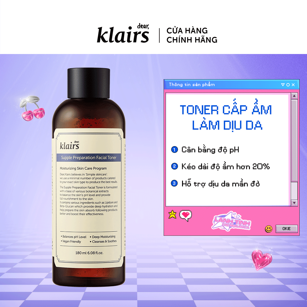 Nước Hoa Hồng Dành Cho Da Nhạy Cảm Klairs Supple Preparation Facial Toner 180ml Công dụng Klairs Supple Preparation Facial Toner: - Duy trì độ cân bằng pH của da. - Kiềm dầu, se khít
