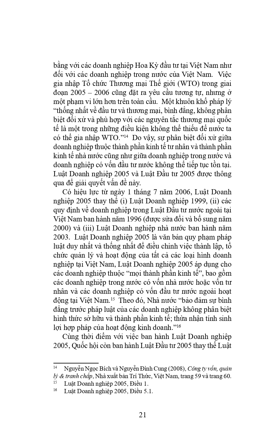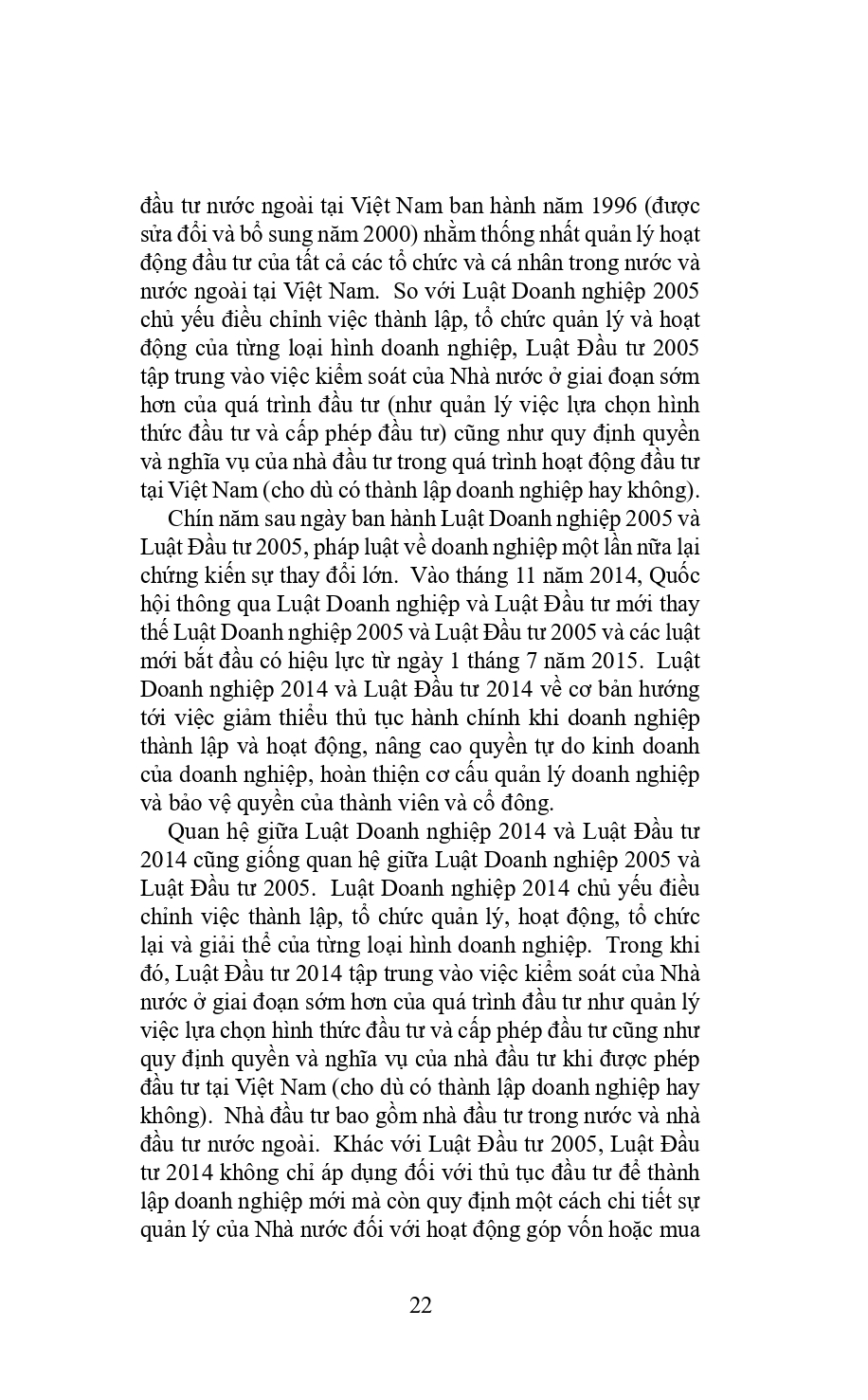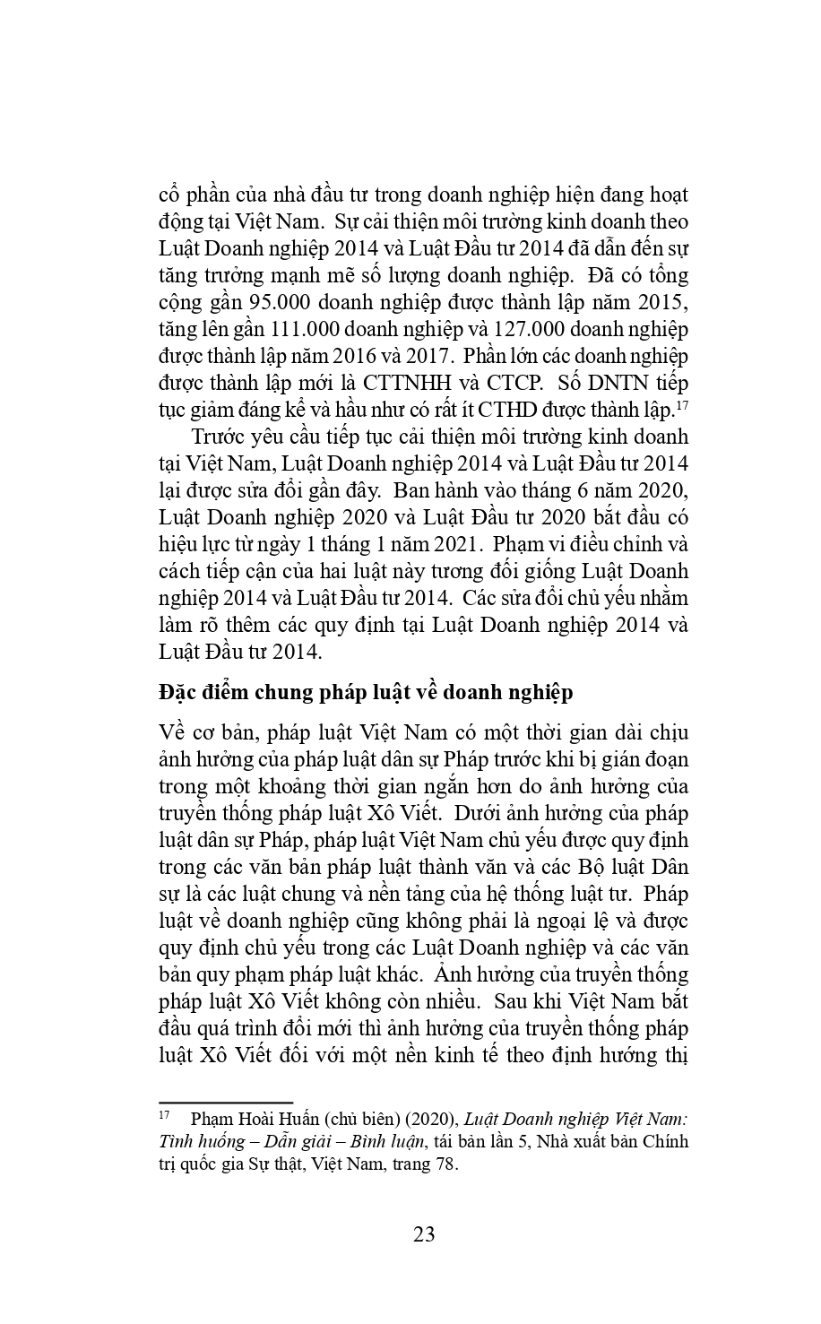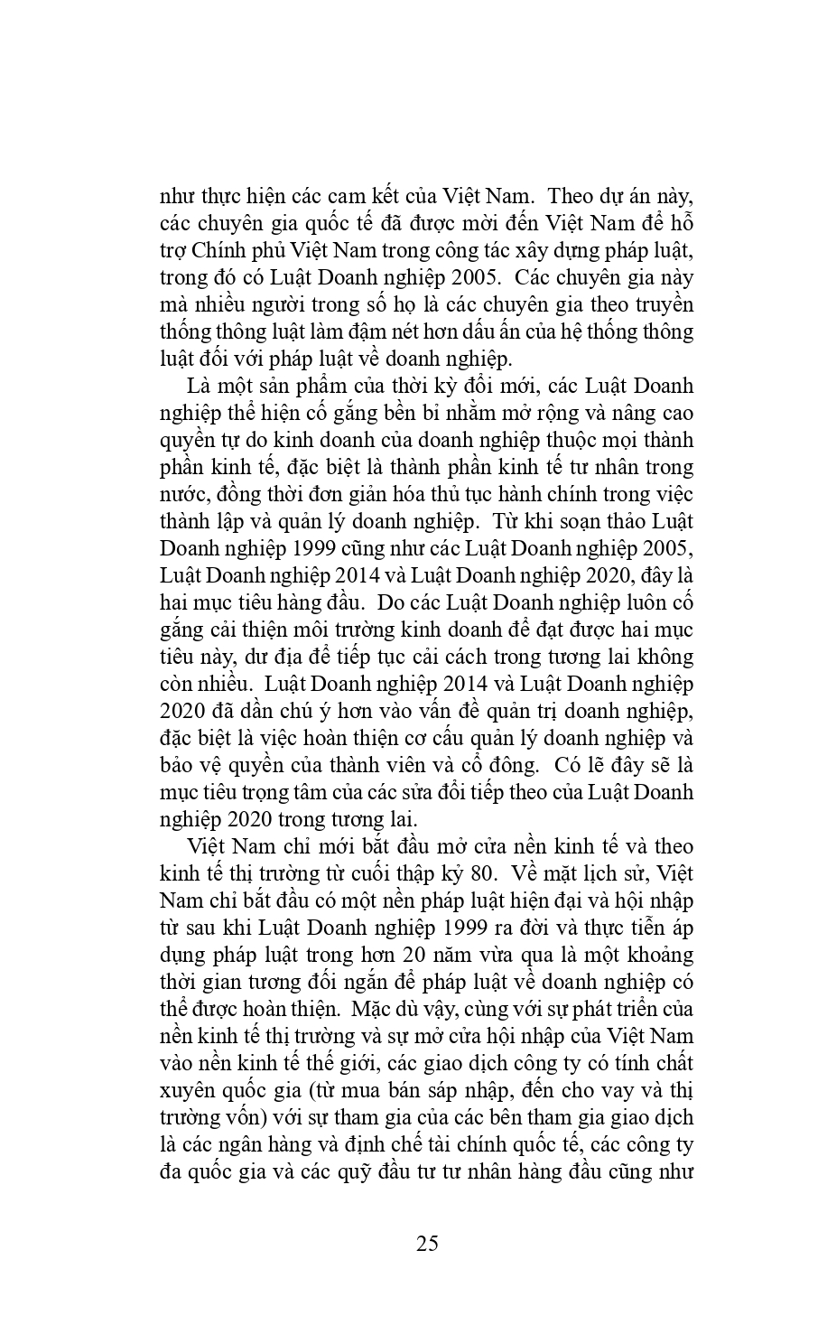 - Pháp luật về doanh nghiệp – Các vấn đề pháp lý cơ bản (tái bản lần 1 năm 2024) Tác giả: Trương Nhật Quang Nhà xuất bản: Dân Trí Công ty phát hành: Công ty TNHH Sách Á Châu Kích thước: 15.5x 24.5 cm Số trang: 1100 trang Ngày phát hành: 3.2024 Hình thức bìa: Bìa mềm Giá bìa: 900.000 đ Lời giới thiệu: Cuốn sách đầu tiên nghiên cứu một cách có hệ thống các vấn đề pháp luật về doanh nghiệp của Việt Nam từ cả góc độ lý thuyết và thực tiễn, tập trung vào các giao dịch mua bán doanh nghiệp và tài chính-ngân hàng có yếu tố nước ngoài dựa trên kinh nghiệm hành nghề thực tế của luật sư Trương Nhật Quang. Công ty luật YKVN nơi tác giả làm việc là một trong các công ty luật hàng đầu Việt Nam và tham gia tư vấn trong nhiều giao dịch giao dịch mua bán doanh nghiệp và tài chính-ngân hàng có yếu tố nước ngoài quan trọng nhất trên thị trường. Đây là ấn bản sửa đổi lần đầu của cuốn sách được luật sư Trương Nhật Quang xuất bản năm 2016. Được viết trong trong 4 năm qua, cuốn sách cập nhập các thay đổi luật từ năm 2016, đặc biệt là Luật Doanh nghiệp năm 2020, Luật Đầu tư năm 2020, Luật Chứng khoán năm2019, Bộ luật Hình sự năm 2015 (được sửa đổi, bổ sung năm 2017) và nhiều văn bản pháp luật quan trọng khác. Do vậy, nội dung cuốn sách gần như được cập nhật lại mới hoàn toàn để phân tích khung pháp lý mới đang áp dụng tại thời điểm hiện nay. Ngoài việc phân tích các văn bản pháp luật, cuốn sách cũng phân tích các án lệ và nhiều bản án, quyết định và phán quyết của tòa án và trọng tài mà tác giả đã sưu tầm trong thời gian qua. Đặc biệt cuốn sách phân tích rất nhiều bản án phúc thẩm và giám đốc thẩm của các tòa án tại Hà Nội, Đà Nẵng và Thành phố Hồ Chí Minh và Tòa án Nhân dân Tối cao. Do vậy, nhiều vấn đề pháp lý cơ bản trình bày trong cuốn sách được phân tích từ góc độ thực tiễn xét xử tại tòa án. Cuốn sách bao gồm nhiều sơ đồ và bảng tóm tắt để giúp người đọc dễ hiểu hơn các vấn đề pháp lý và cơ cấu giao dịch được trình bày trong cuốn sách. Ngoài ra, để giúp người đọc tiện tra cứu, cuốn sách có (i) bảng tra cứu từ khóa, (ii) bảng tra cứu án lệ, bản án và quyết định và (iii) danh sách các tài liệu trích dẫn. Trải dài trong hơn 1000 trang, cuốn sách phân tích các vấn đề pháp lý cơ bản liên quan đến việc thành lập, tổ chức quản lý và hoạt động của doanh nghiệp. Kết cấu của cuốn sách gồm hai mươi chương và chia làm năm phần, tập trung vào hai hình thức doanh nghiệp thông dụng nhất là công ty trách nhiệm hữu hạn (CTTNHH) và công ty cổ phần (CTCP). • Phần I (từ Chương 1 đến Chương 9) phân tích các vấn đề pháp lý chung và áp dụng cho mọi loại hình doanh nghiệp. • Phần II (từ Chương 10 đến Chương 12) tập trung vào các vấn đề pháp lý liên quan đến tư cách và quyền của thành viên CTNHH và cổ đông CTCP. • Phần III (từ Chương 13 đến Chương 15) trình bày các vấn đề pháp lý về quản trị CTTNHH và CTCP. • Phần IV (Chương 16 và Chương 17) trình bày các vấn đề pháp lý liên quan đến huy động vốn dưới hình thức phát hành chứng khoán và biện pháp bảo đảm. • Phần V (từ Chương 18 đến Chương 20) trình bày các vấn đề pháp lý áp dụng riêng cho công ty đại chúng. Cuốn sách được viết chủ yếu dành cho luật sư, người tham gia công tác giảng dạy, sinh viên luật và người quản lý doanh nghiệp mong muốn tìm hiểu các vấn đề pháp lý về doanh nghiệp. Đặc biệt, cuốn sách giúp các luật sư hành nghề có thể tham khảo khi tư vấn trong các giao dịch doanh nghiệp, đặc biệt là các giao dịch mua bán doanh nghiệp và tài chính-ngân hàng có yếu tố nước ngoài.