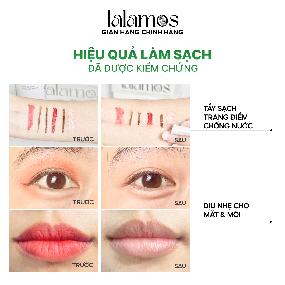 Tẩy sạch hoàn toàn lớp trang điểm, bụi bẩn và dầu thừa, kể cả trang điểm chống nước, mà không làm khô rát da hay gây kích ứng.