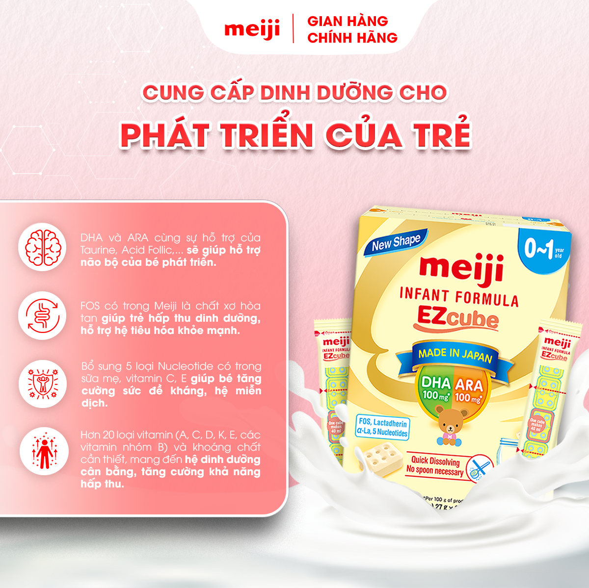 - Combo sản phẩm Meiji Infant Formula EZcube và Meiji Growing up Formula EZcube cung cấp đầy đủ nhu cầu vitamin và chất khoáng cần thiết cho trẻ trong giai đoạn từ 0-1 tuổi và 1-3 tuổi theo khuyến nghị của FAO/WHO, mang đến nguồn năng lượng và dinh dưỡng cân bằng để đảm bảo cho sự phát triển tối ưu cho trẻ. CÔNG DỤNG SẢN PHẨM