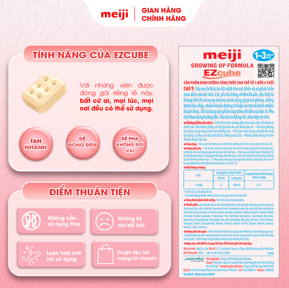 - Meiji Growing Up Formula EZcube là sản phẩm dạng viên, đóng gói trong hộp giấy hình hộp chữ nhật, trọng lượng 560g gồm thanh/ hộp và 5 viên/ thanh. ĐẶC ĐIỂM SẢN PHẨM