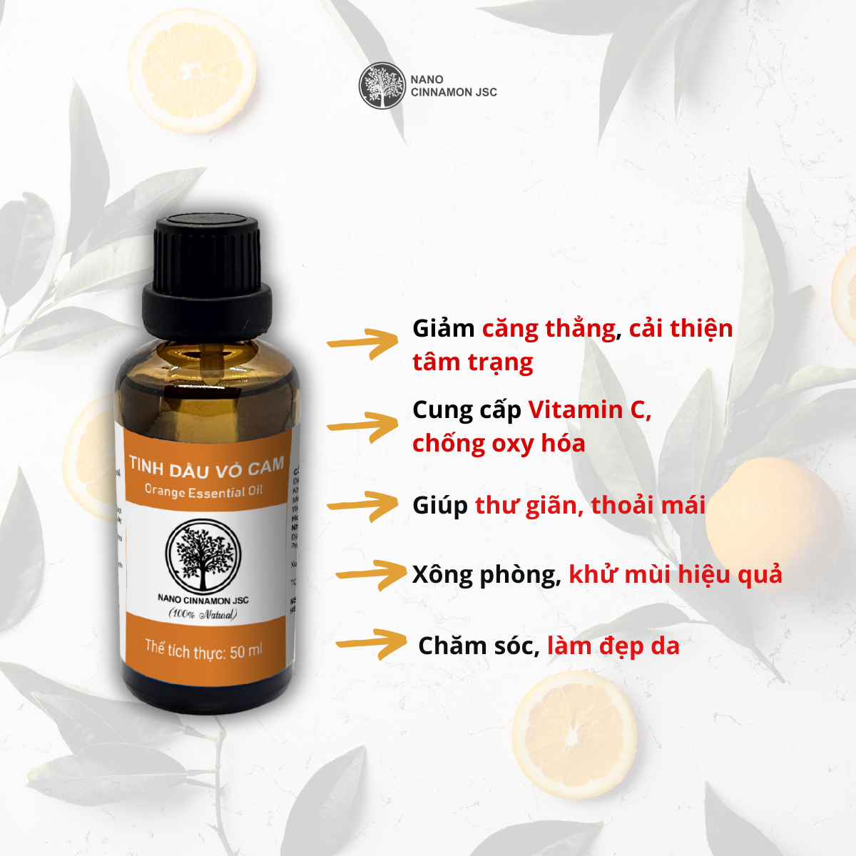 Tinh dầu Cam: Tinh dầu cam tự nhiên có mùi hương dịu nhẹ, thanh mát, giúp tạo không gian tươi mới, mang lại cảm giác thoải mái và dễ chịu.