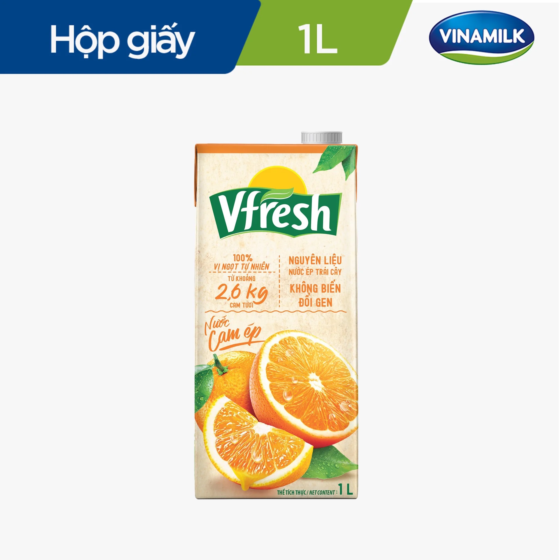 Nước trái cây Vfresh 100% được ép từ nguồn trái cây tươi ngon tự nhiên, hoàn toàn không chứa chất bảo quản, giữ trọn vị trái cây, giàu dưỡng chất, cho cơ thể khỏe mạnh và tràn đầy sức sống. Chăm sóc sức khỏe cho cả gia đình Thông tin sản phẩm    Xuất xứViệt NamDung tích1LThành phầnNước cam ép từ nước cam cô đặc (50%), nước, đường tinh luyện, chất ổn định (440), chất chống oxy hóaHướng dẫn bảo quảnBảo quản nơi khô ráo, thoáng mát, sau khi sử dụng, đậy kín và bảo quản trong tủ lạnh (6 - 8 độ C) và dùng hết trong vòng 3 ngàyHướng dẫn sử dụngDùng trực tiếp, lắc đều trước khi uống. Ngon hơn khi uống lạnh                       Nước cam Vfresh được sản xuất trên quy trình công nghệ hiện đại, đã qua quá trình kiểm định độ an toàn vệ sinh thực phẩm. Trong 1 lít nước cam được làm từ khoảng 1,3kg trái cam tươi, giàu vitamin C, hoàn toàn không chứa chất bảo quản và không sử dụng màu thực phẩm. Sản phẩm giúp tăng cường sức đề kháng, cho cơ thể khỏe mạnh mỗi ngày. Không chỉ vậy, Nước cam Vfresh còn có tác dụng giải nhiệt rất tốt, giúp tăng cường năng lượng cho cơ thể sau khi vận động và đem lại làn da mịn màng, tươi trẻ cho chị em phụ nữ. Nước cam Vfresh được thiết kế hộp tiện dụng, vỏ hộp làm bằng giấy tráng nhôm, bảo quản nước ép luôn giữ được hương vị tự nhiên thơm ngon, đem lại sự yên tâm cho người sử dụng.  MẪU BAO BÌ THAY ĐỔI THEO TỪNG ĐỢT NHẬP HÀNG.