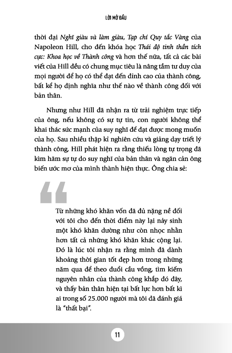 Công Thức Tự Tin - Để Vươn Tới Sự Tự Lập Và Thành Công Thiếu tự tin là một trong những căn bệnh phổ biến nhất của thế giới ngày nay, gây ra sự bất lực tràn lan, thiếu tự chủ, thiếu mục đích, trì trệ và tuyệt vọng đặc trưng của xã hội hiện đại. Nhưng như ông trùm ngành thép Andrew Carnegie đã nhấn mạnh với Napoleon Hill: “Tự tin là một trạng thái tâm trí, là yếu tố cần thiết để thành công, và điểm khởi đầu của việc phát triển lòng tự tin và sự rõ ràng về mục đích.” Niềm tin vào bản thân và khả năng của bạn quyết định việc bạn thất bại hay thành công. Công thức tự tin giúp bạn tăng cường sự tự tin của mình thông qua việc áp dụng các chiến lược của Hill để kiểm soát suy nghĩ của bạn. Bằng cách thực hiện những nguyên tắc này, bạn sẽ không chỉ có thể suy nghĩ và hành động tốt hơn – thu hút nhiều cơ hội hơn, tạo được ảnh hưởng và củng cố các mối quan hệ - mà còn có thể truyền đạt phẩm chất quan trọng này cho những người khác. Cuốn sách giúp bạn mở khóa thành công và sự thỏa nguyện bằng cách trang bị cho bạn: Giải phóng nỗi sợ hãi, bất an và những hạn chế mắc phải trong thời thơ ấu và thiếu niên Tạo điều kiện cho tâm trí tin vào sự chắc chắn thành công của bạn Hành động mạnh dạn, tự tin nhằm đạt được mục tiêu chính xác định của bạn Chinh phục mặc cảm tự ti của bạn thông qua nguyên tắc trí tuệ ưu tú Xây dựng tính tự lập và lòng tự trọng của tuổi trẻ ngày nay Bạn đang trên hành trình sống tự tin và có mục đích. Khi bạn thực hiện các nguyên tắc của Hill, bạn sẽ trau dồi trạng thái tinh thần của mình để sẵn sàng đón nhận những cơ hội phong phú dành riêng cho bạn. Công thức tự tin sẽ giúp bạn xây dựng ý thức mạnh mẽ về giá trị bản thân để bạn có thể nhận biết cơ hội, hành động để đạt được ước mơ và tăng cường sự bền bỉ của bạn tốt hơn. Thông tin về tác giả Napoleon Hill là tác giả truyền cảm hứng nổi tiếng rất được yêu thích tại Mỹ. Ông có một sự nghiệp viết lách, giảng dạy vô cùng thành công về những nguyên tắc thành công. Các tác phẩm của ông được coi là tượng đài đối với việc xây dựng thành tựu cá nhân và cột mốc quan trọng trong phong trào truyền cảm hứng từ những cuốn sách kĩ năng.