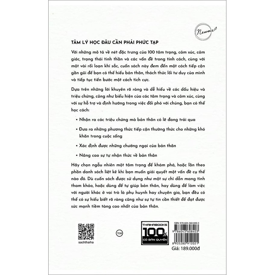 Tâm lý học đâu cần phải phức tạp Với những mô tả về nét đặc trưng của 100 tâm trạng, cảm xúc, cảm giác, trạng thái tinh thần và các tật trong tính cách, cùng với một vài rối loạn khí sắc, cuốn sách này đem đến một cách tiếp cận gần gũi để bạn có thể hiểu bản thân, thách thức lối tư duy của mình và tiếp tục tiến bước theo một cách tích cực. Dựa trên những lời khuyên rõ ràng và dễ hiều về các dấu hiệu và triệu chứng, về việc những tâm trạng và cảm xúc biểu hiện ra ngoài như thế nào, đồng thời cả sự hỗ trợ và định hướng trong việc đối phó với chúng, bạn có thể học cách: